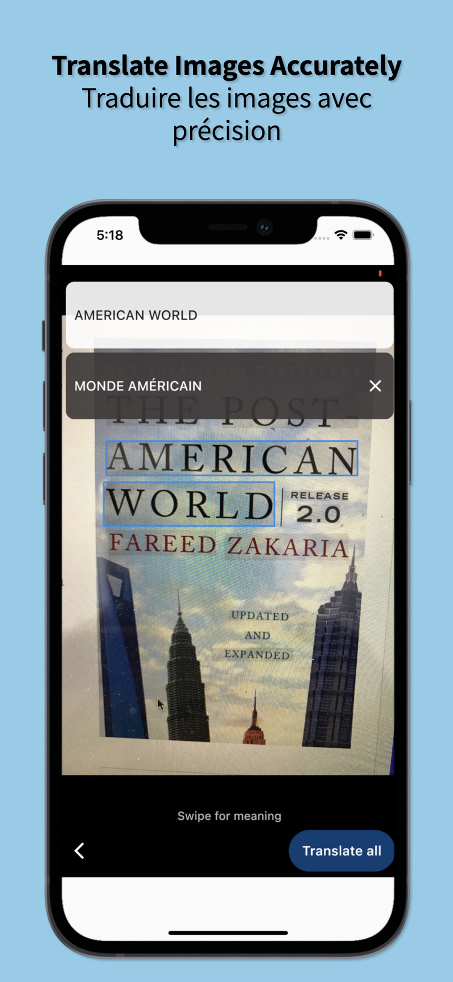Automatically recognize and translate text in images by taking a photo and pressing a button, can touch a word to know its meaning or see all translated