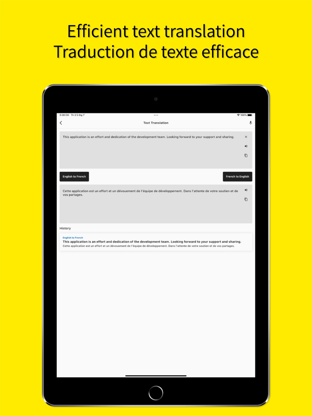 Real-time English or French text translation for phrases and words, voice to text translation