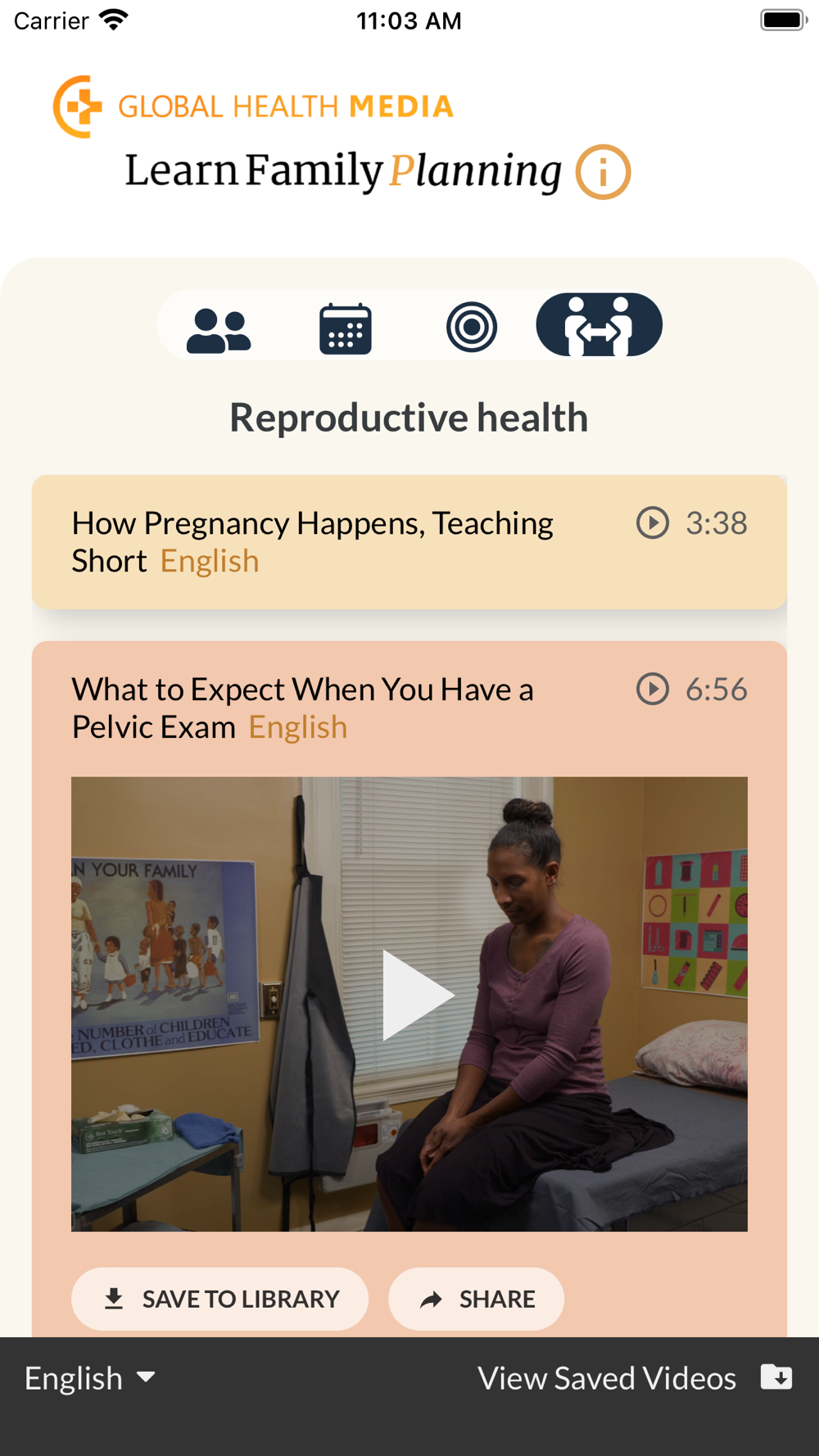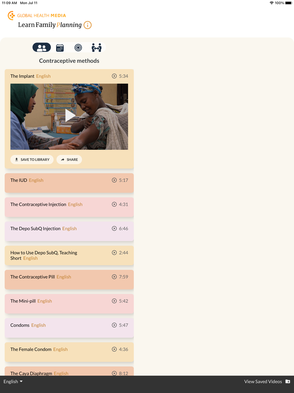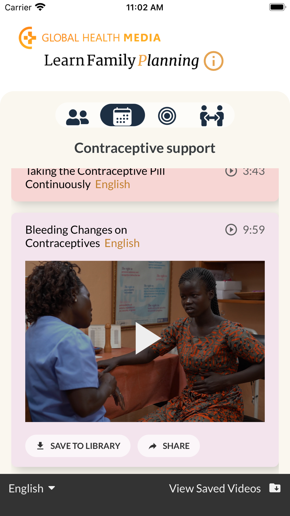 This app gives you access to 23 videos produced by Global Health Media Project. The videos offer clear, up-to-date information to help women and their partners understand their contraceptive options and how to use their method of choice effectively. The videos are arranged in four topic areas: contraceptive methods, contraceptive support, comparing methods, and reproductive health. Videos are available in several languages, and the app will be updated whenever additional languages are available. You can use this app to watch the videos, save them to your phone to use offline, or share with others.
