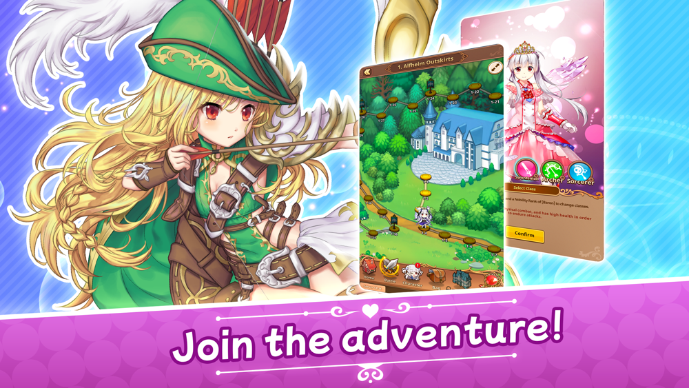 Meet lovely girls drawn in Spine 2D Animation! No need for multiple accounts! You can freely change between the Warrior, Archer, and Wizard classes! Emotional illustration designed by famous Japanese manga artist Takuya Fujima!