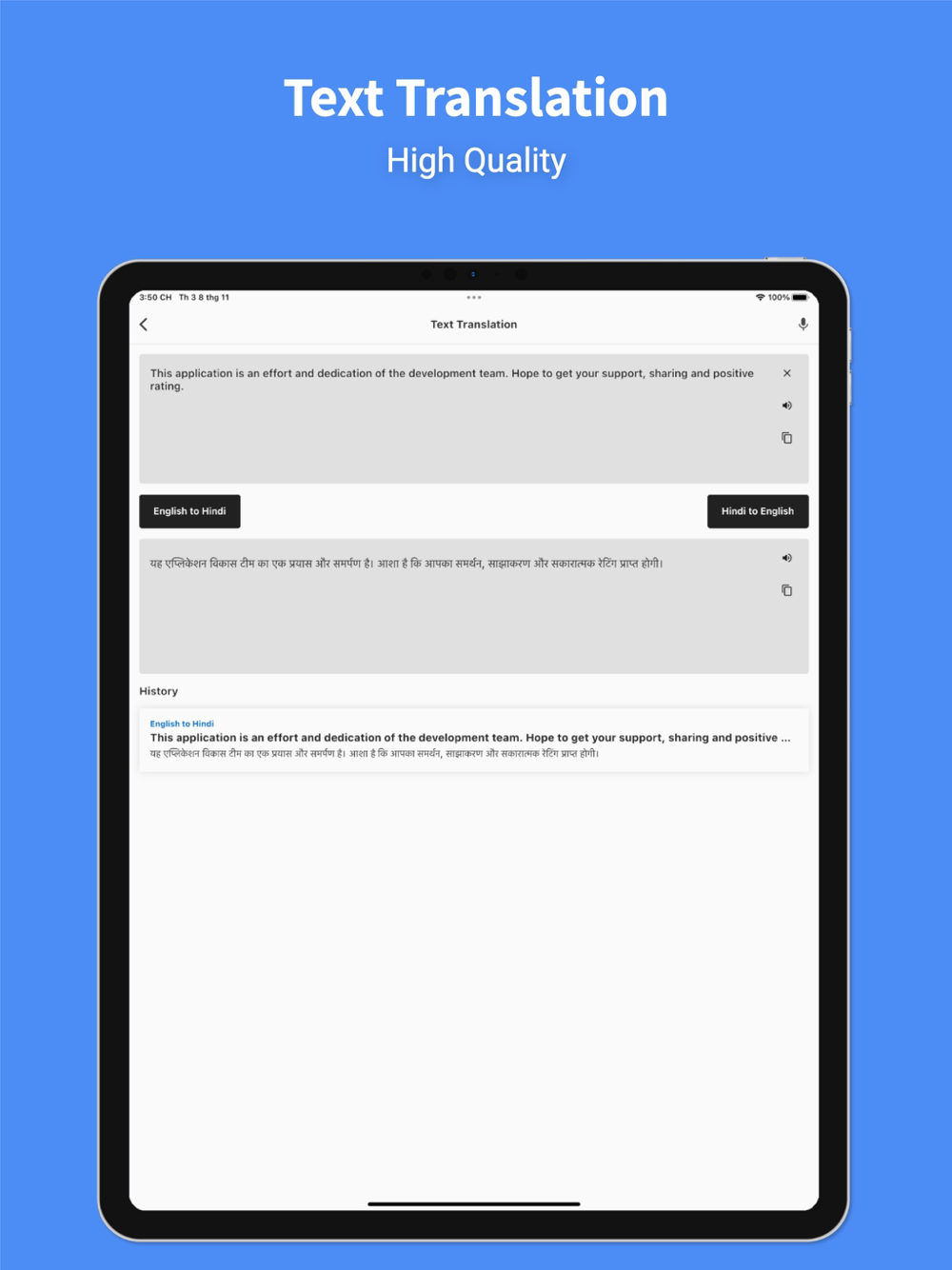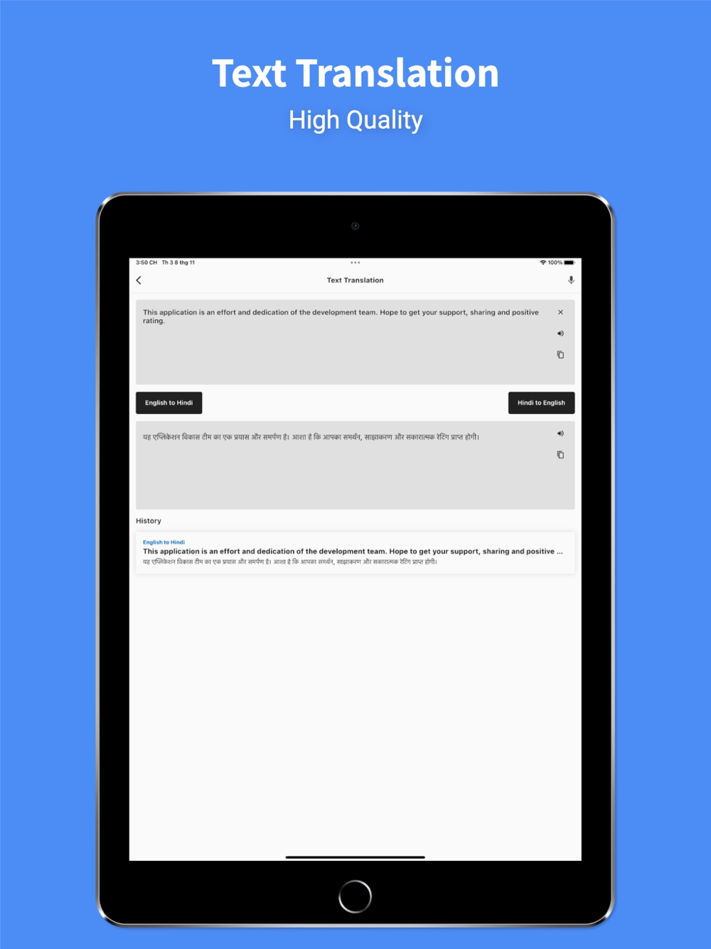 Real-time English or hindi text translation for phrases and words, voice to text translation