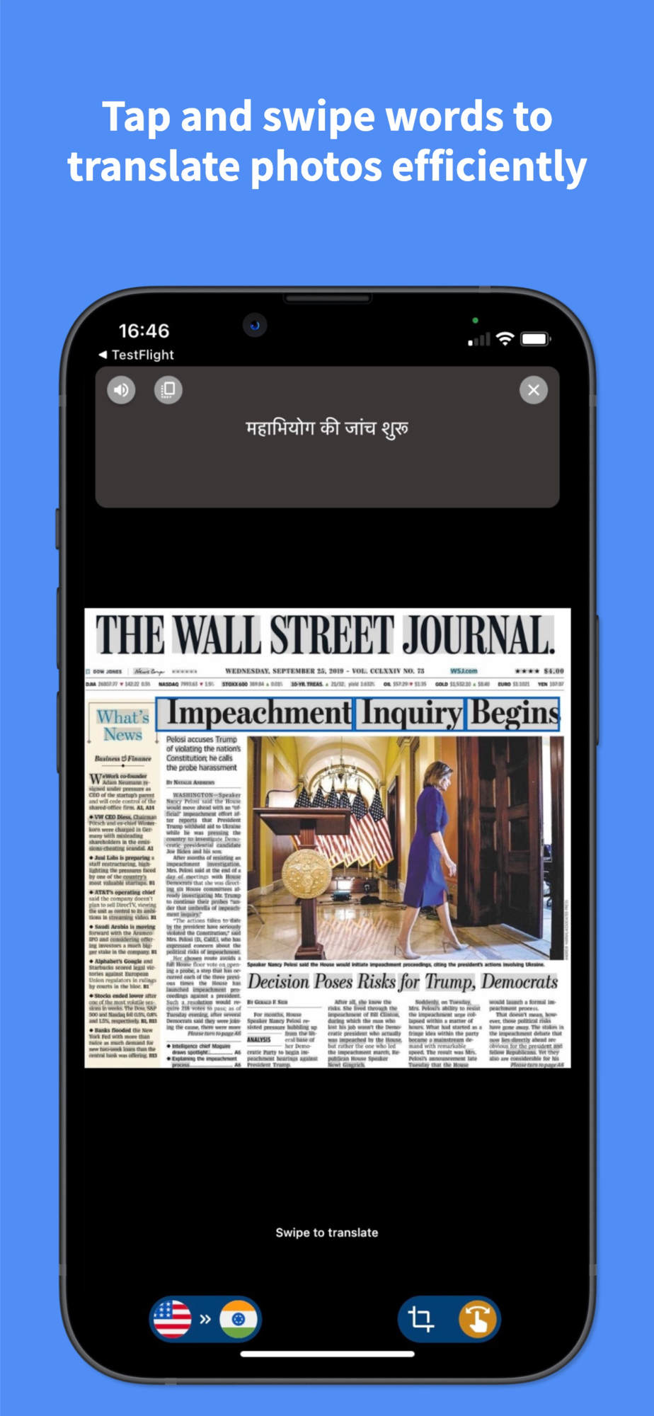 Automatically recognize and translate text in images by taking a photo and pressing a button, can touch a word to know its meaning or see all translated