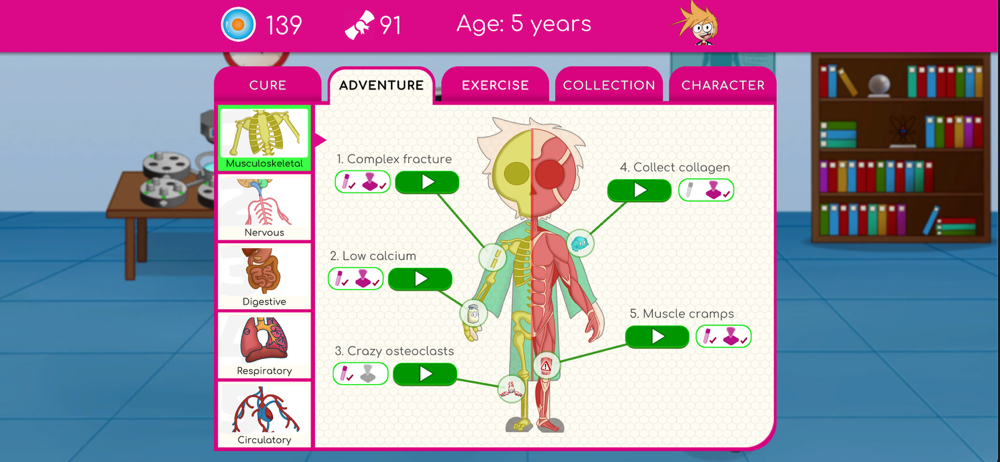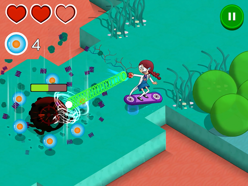 Hold on to the nanoskate to slide through the human body systems and save Finn, but remember, you will need to get the nanobots solution to heal him. Get them by solving fun science challenges across the body systems: musculoskeletal, digestive, circulatory, respiratory, nervous… overcome them all to save your best friend… and the world!