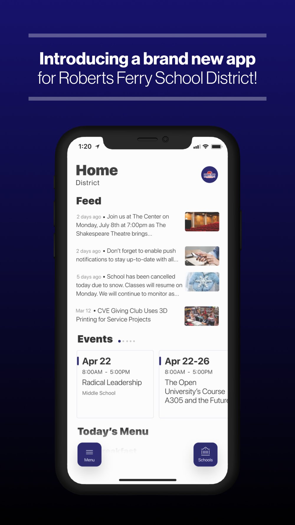 The event section shows a list of events throughout the district. Users can add an event to their calendar to share the event with friends and family with one tap.