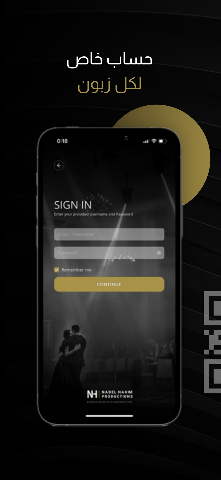 The app contains photos from different events belonging to Nabel Hakim customers and it was designed as a solution to deliver the work (photos) between Nabel Hakim Productions (company) and its customers in an efficient manner. Instead, to deliver all the work on a USB drive, which costs him a lot and is even not environment friendly. So, this App allows the business manager to create usernames and passwords for his customers for free to deliver the work fast and easily in a nature-friendly way. Only customers with a username and password assigned to an event created by the company can access the content of their specific event (engagement, wedding, graduation, circumcise! etc)