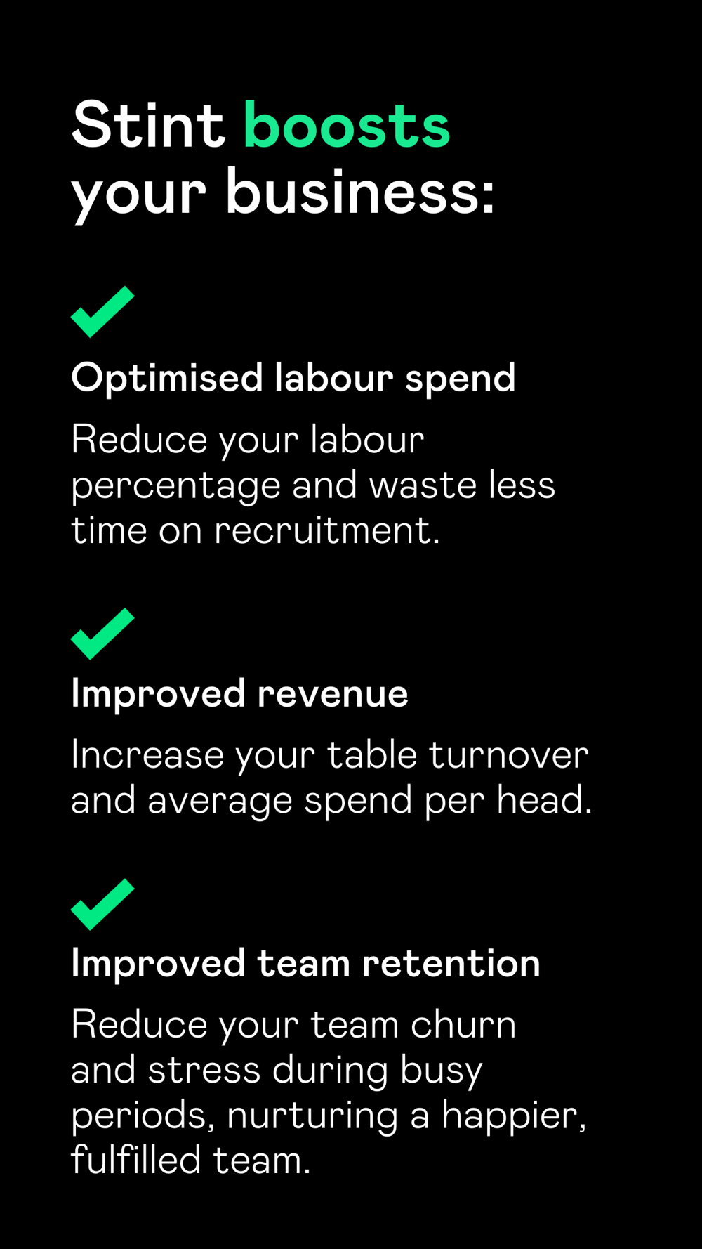 - Optimised labour spend - reduce your labour percentage and waste less time on recruitment.