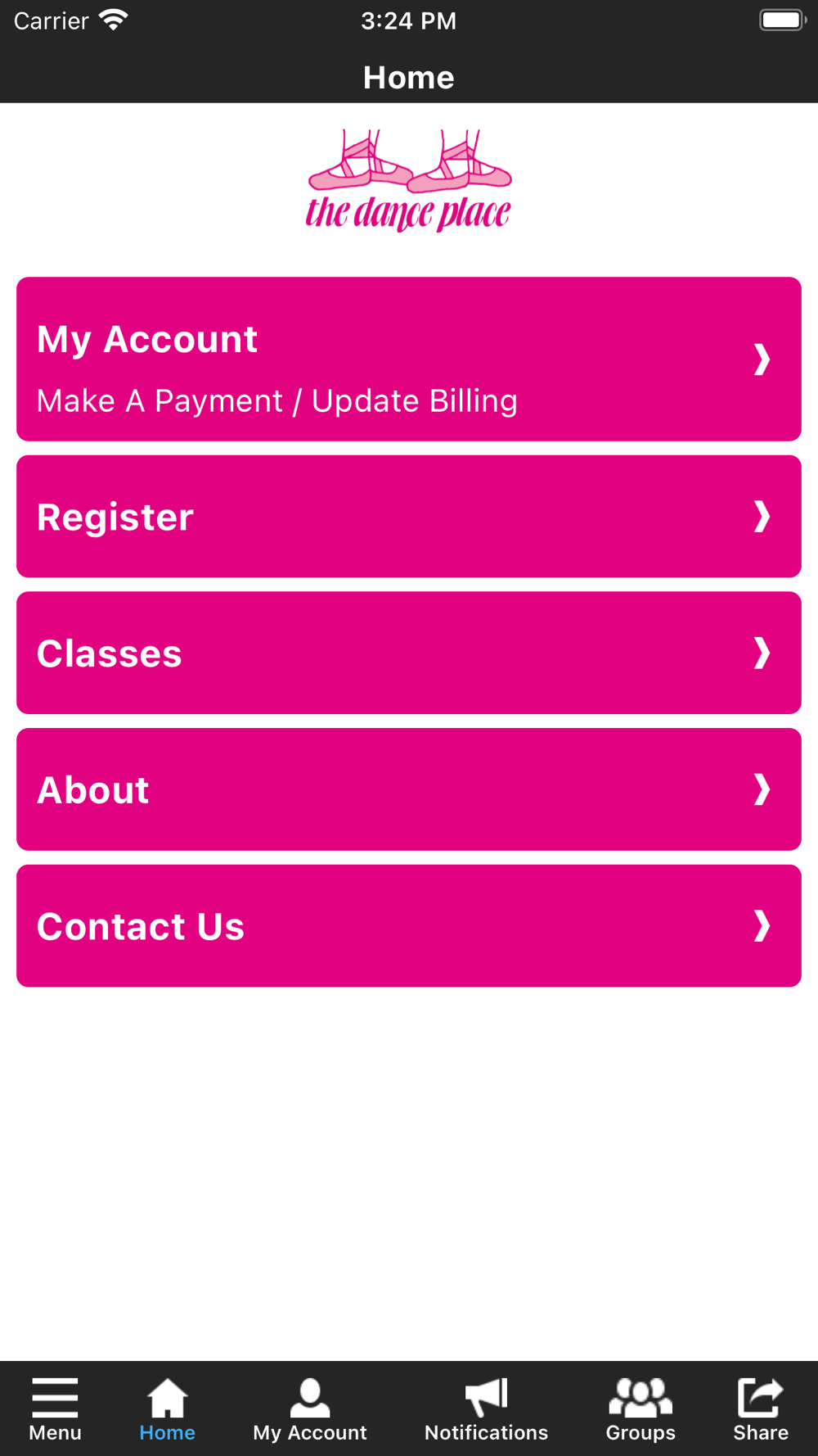 The dance place app allows you to manage your account with ease, register for classes, and special events. You'll also receive important notifications about class changes, closings, registration openings, special announcements, and upcoming events.