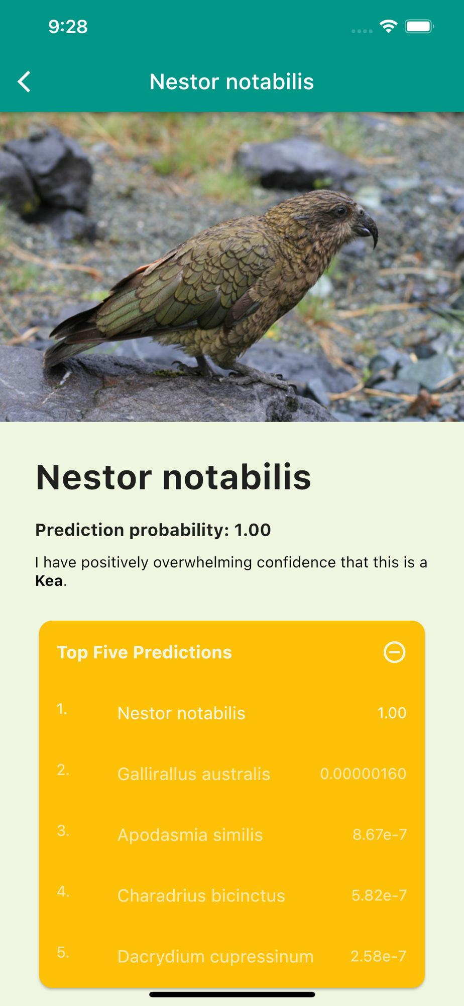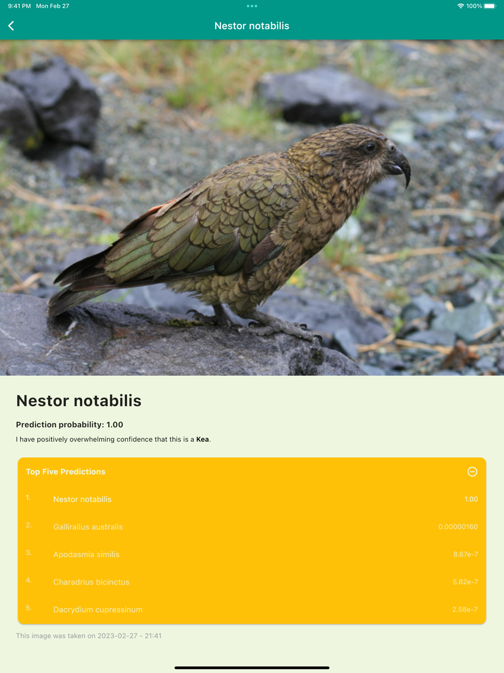 An app for classifying species found in Aotearoa New Zealand. Includes a model trained on 14991 species, both plants and animals, native and invasive, that can be found around New Zealand. Allows taking images by camera or selecting images from local storage. The model runs locally, so no network connection is required to make classifications.