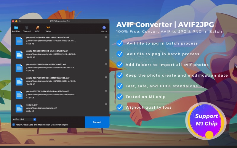 AVIF to JPG | AVIF Converter is a neat and straightforward application that converts AVIF to standard and general JPG and PNG. It also enables you to convert JPG and PNG to AVIF. Support your Mac with M1 Chip!