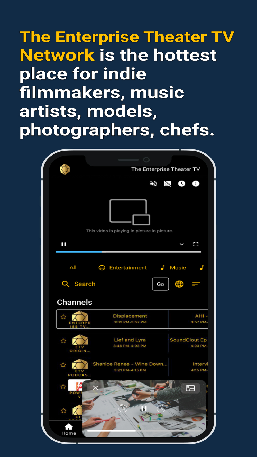 The Enterprise Theater TV Network has multiple channels of 24/7 content that features creatives from around the world. Listen to the latest indie music artist, watch the Images channel to discover some of the most beautiful models & fashion designers. Tune in to the cooking channel to experience some of the most delicious recipes. And there’s more to come!! Download the App Today & Discover Something New!!