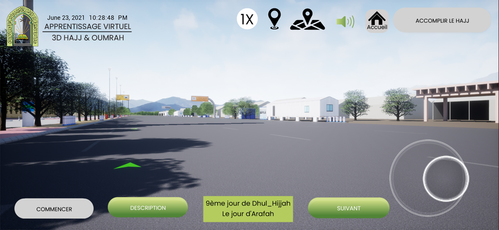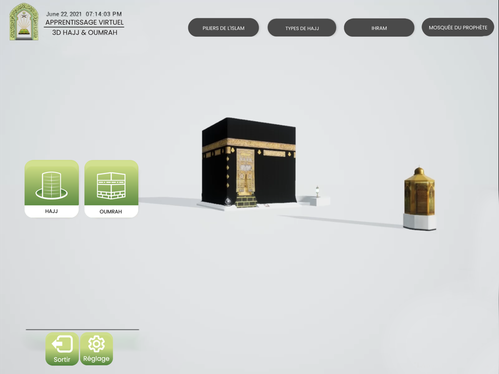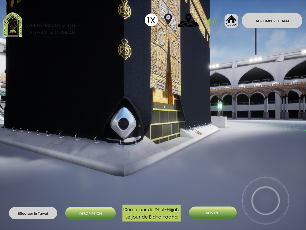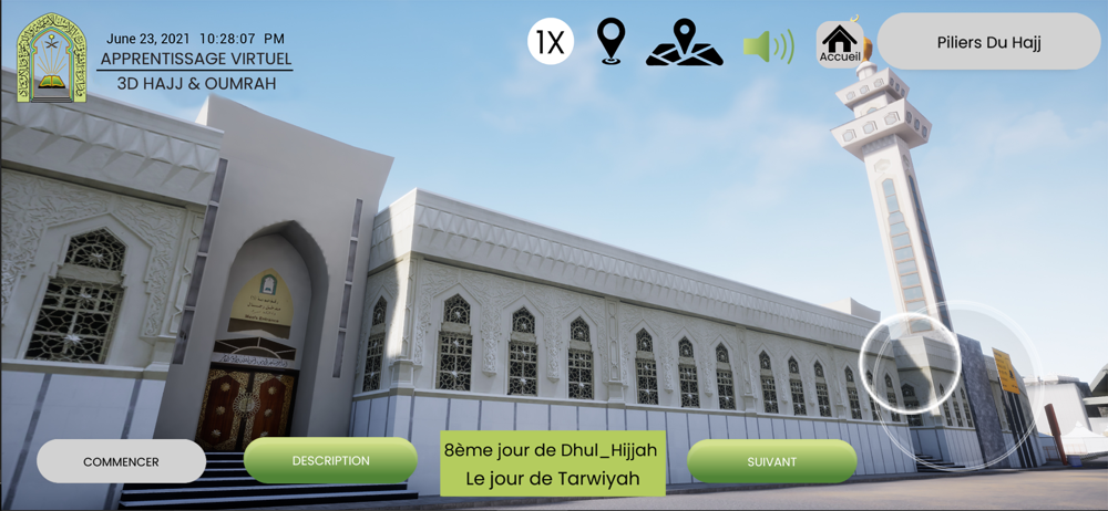 Le projet porte sur l'apprentissage virtuel, tridimensionnel, multilingue et multiplateforme pour le Hajj et la Oumrah. Il vise à former les utilisateurs à l'accomplissement correct des rituels du Hajj et de la Oumrah et à réduire autant que possible les erreurs courantes commises par les participants au pèlerinage, en apprenant des techniques étape par étape à l'aide de modèles tridimensionnels et de la réalité virtuelle, et cherche également à montrer aux non-musulmans qui ne peuvent pas visiter les lieux saints le sens du pèlerinage.