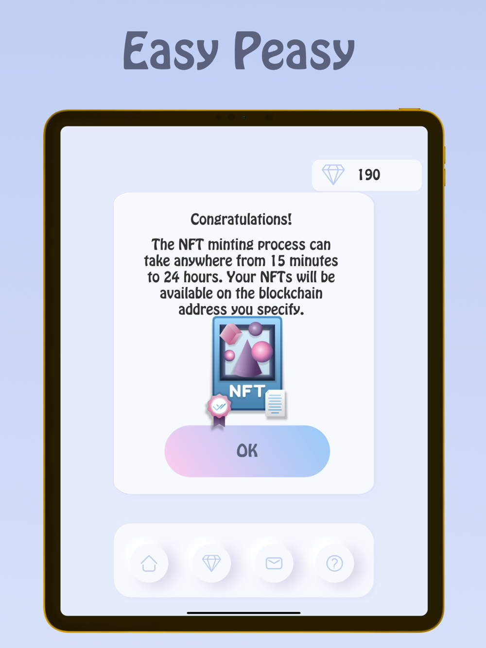The NFT minting process can take anywhere from 15 minutes to 24 hours. Your NFTs will be available on the blockchain address you specify.