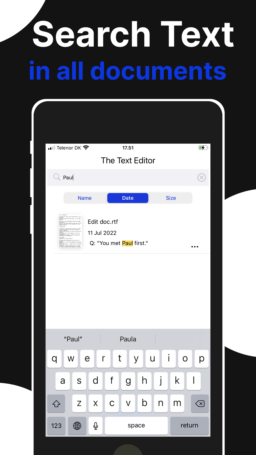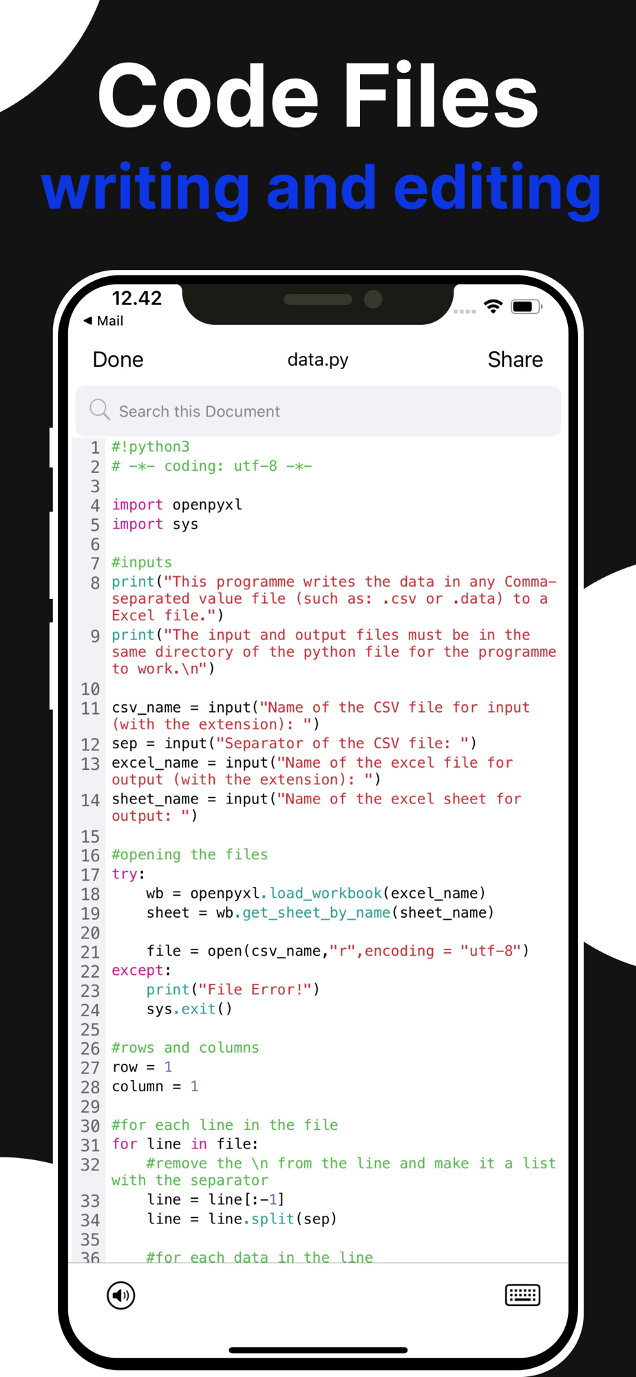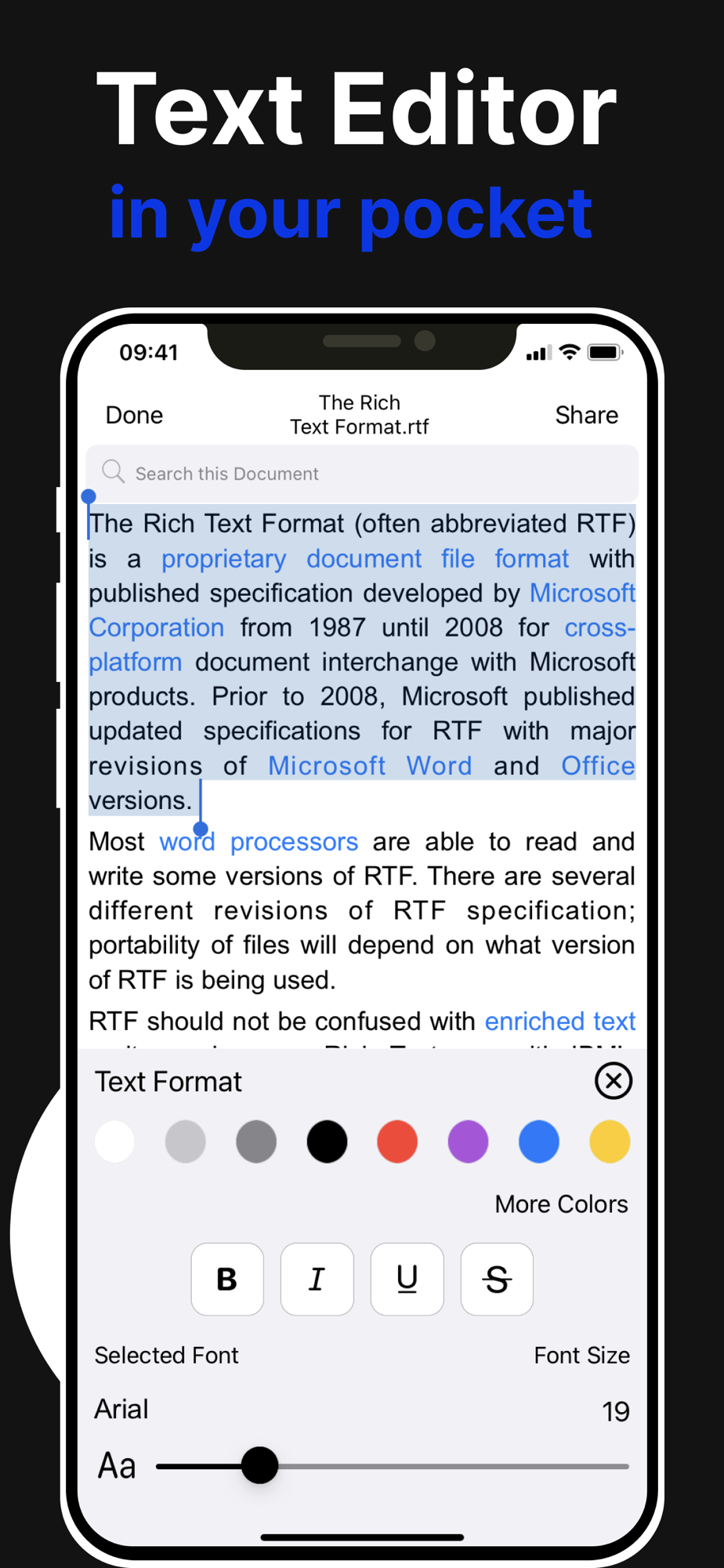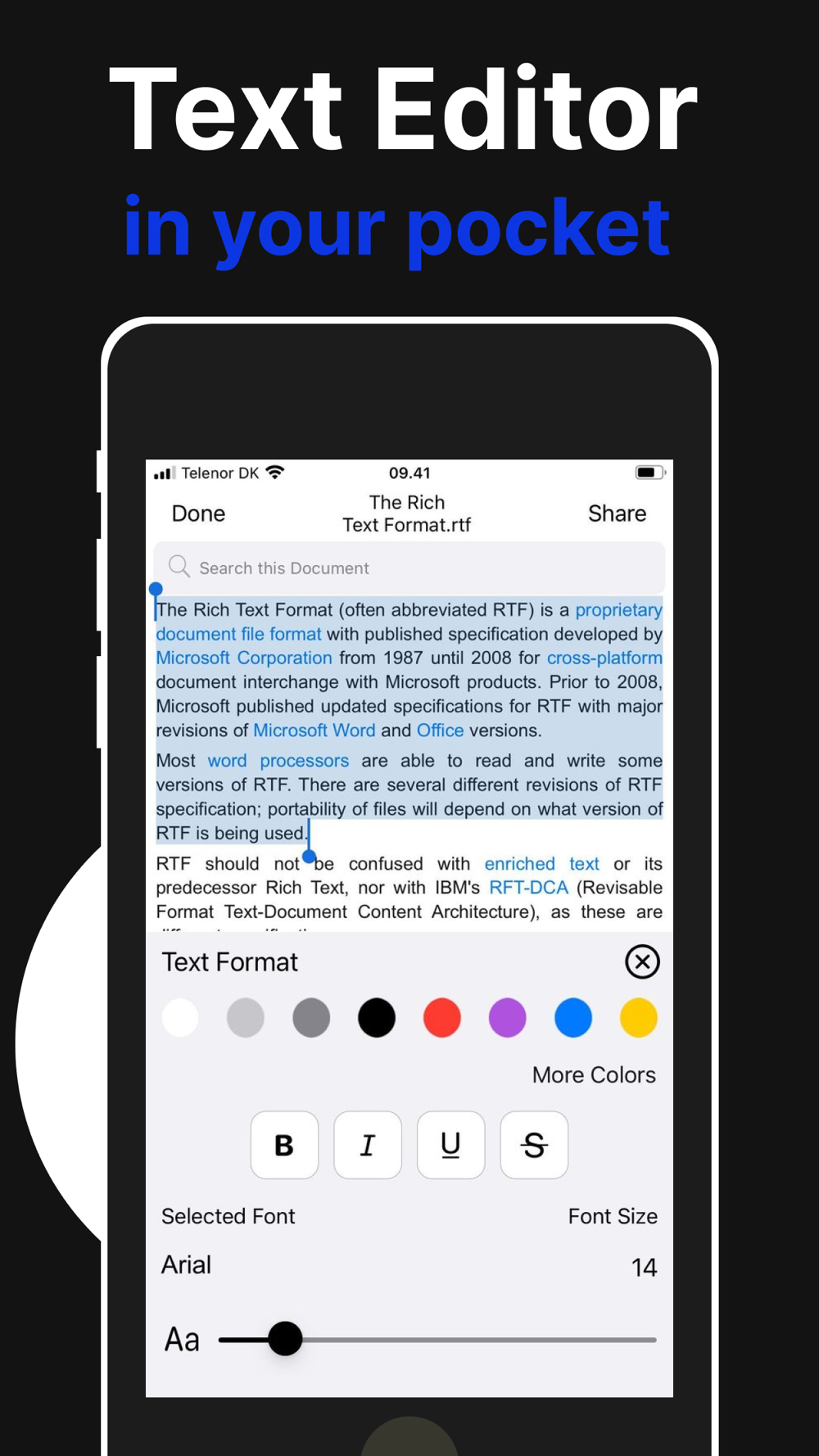 The Text Editor is a quick edit text editor. It is made easy to open and edit text files on your device. The powerful editing and formatting tools allow you to do a lot about your text before exporting it as PDF, Word, RTF, or TXT files.