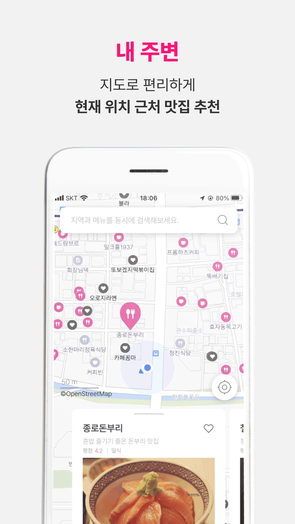 현재 위치를 설정하여 근처 맛집을 검색할 수 있어요. 데이트, 소개팅, 각종 모임부터 서울, 부산, 전주, 강릉, 제주 등 낯선 여행지 맛집도 간편하게 찾아보세요!