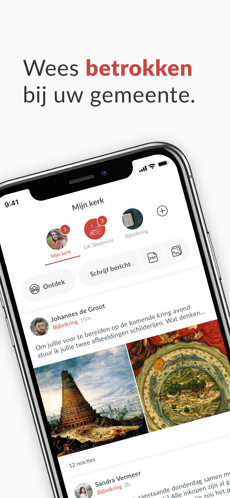 Dankzij onze unieke groepenstructuur helpen wij kerken beter te communiceren. Met de hele gemeenschap, maar ook onderling. U kunt zelf groepen toevoegen en mensen daarvoor uitnodigen. Een slimme timeline zorgt er voor dat iedere gebruiker persoonlijke en relevante informatie ziet.