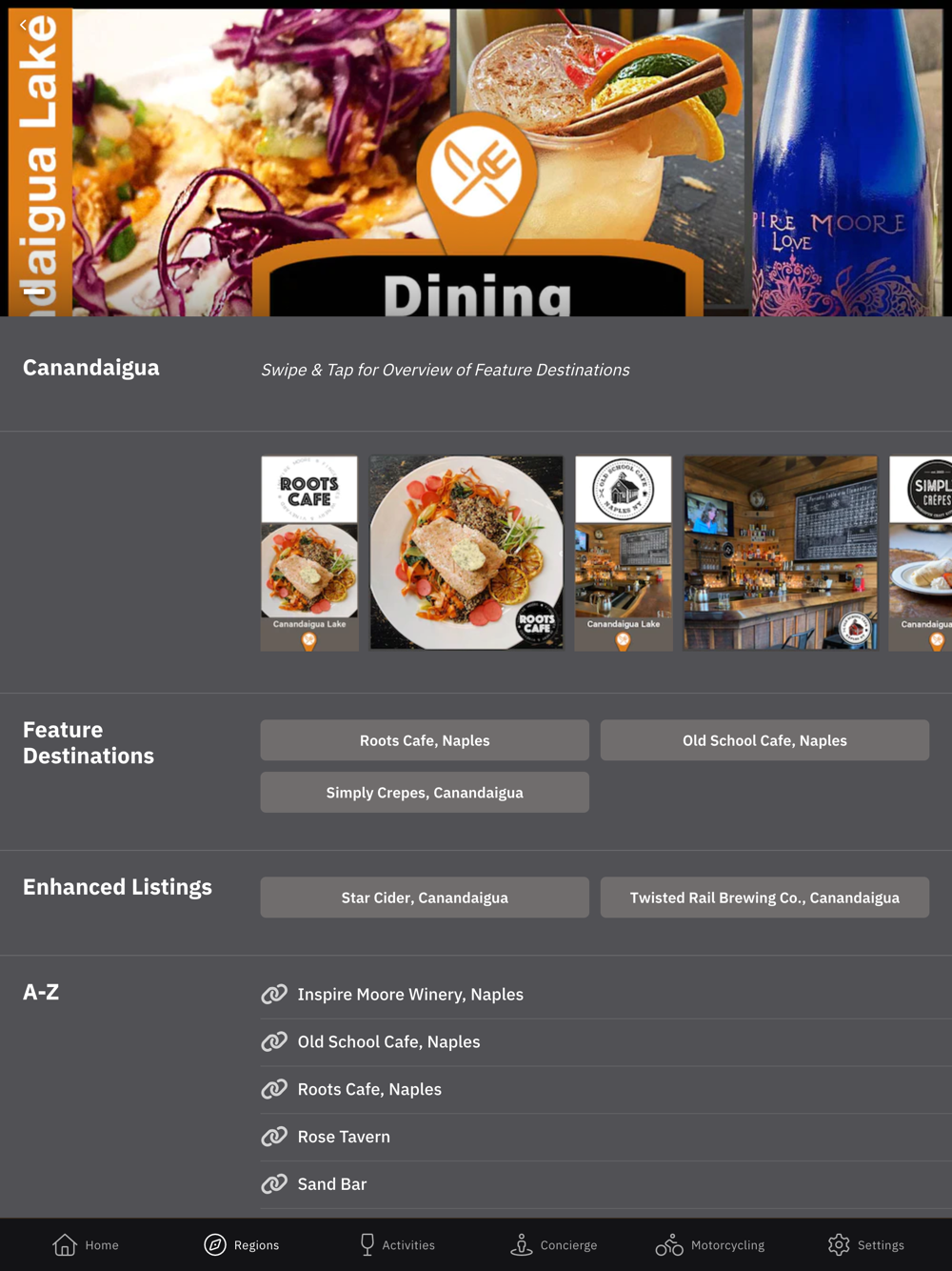 The Virtual Concierge Helps You Make Great Choices! From wineries and restaurants to hotels and entertainment activities, only the best destinations are vetted and presented as Featured Destinations on the main tour map. All other A-Z Listings appear in a side-stack on the downloaded collection.