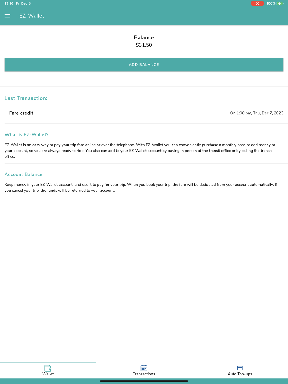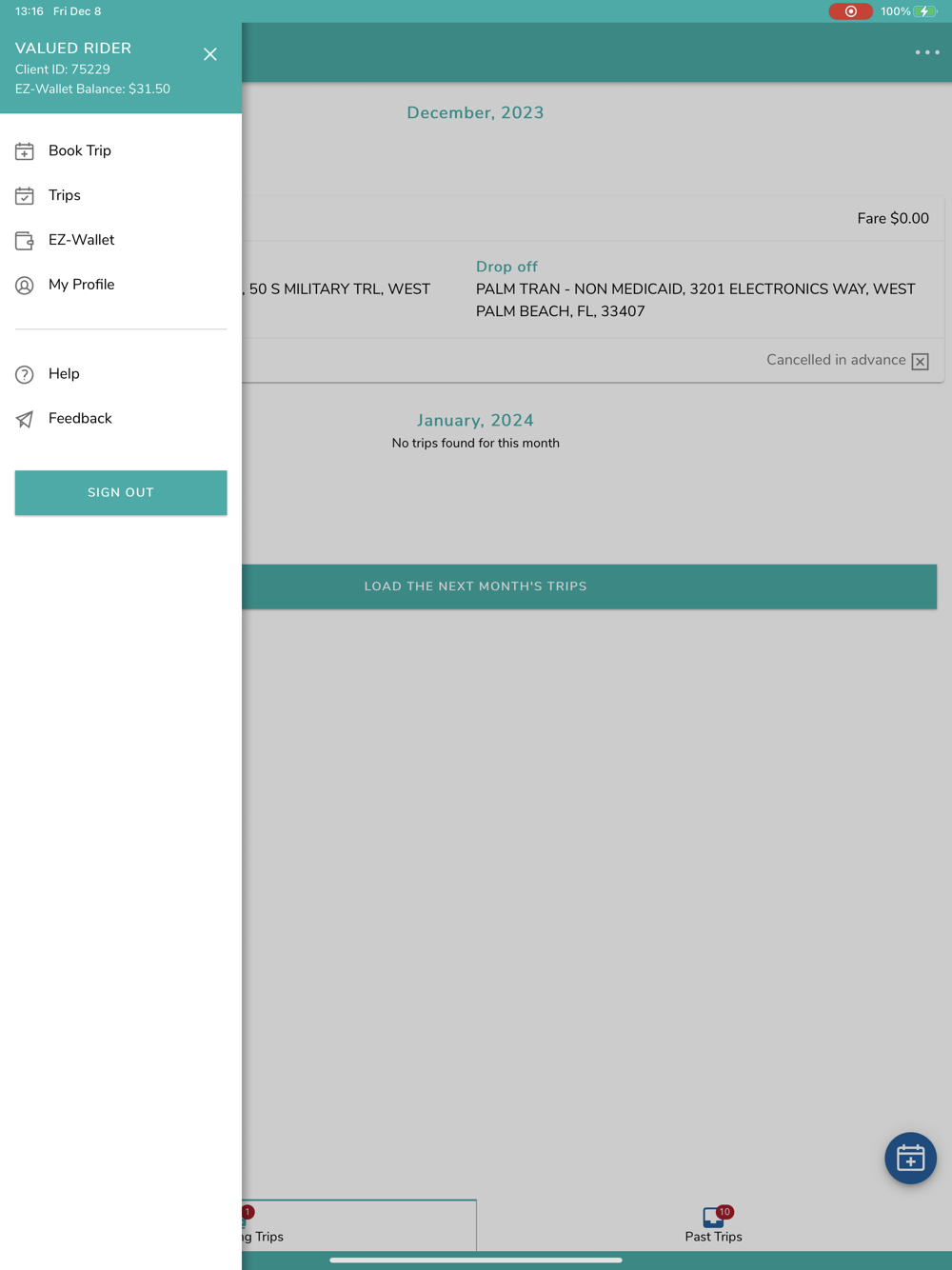 The Palm Tran Connection app is for reserving door-to-door trips up to three days in advance, checking on live trip status, canceling trips on the same day or future booked trips, checking eligibility status, updating contact information, or adding compliments or complaints.
