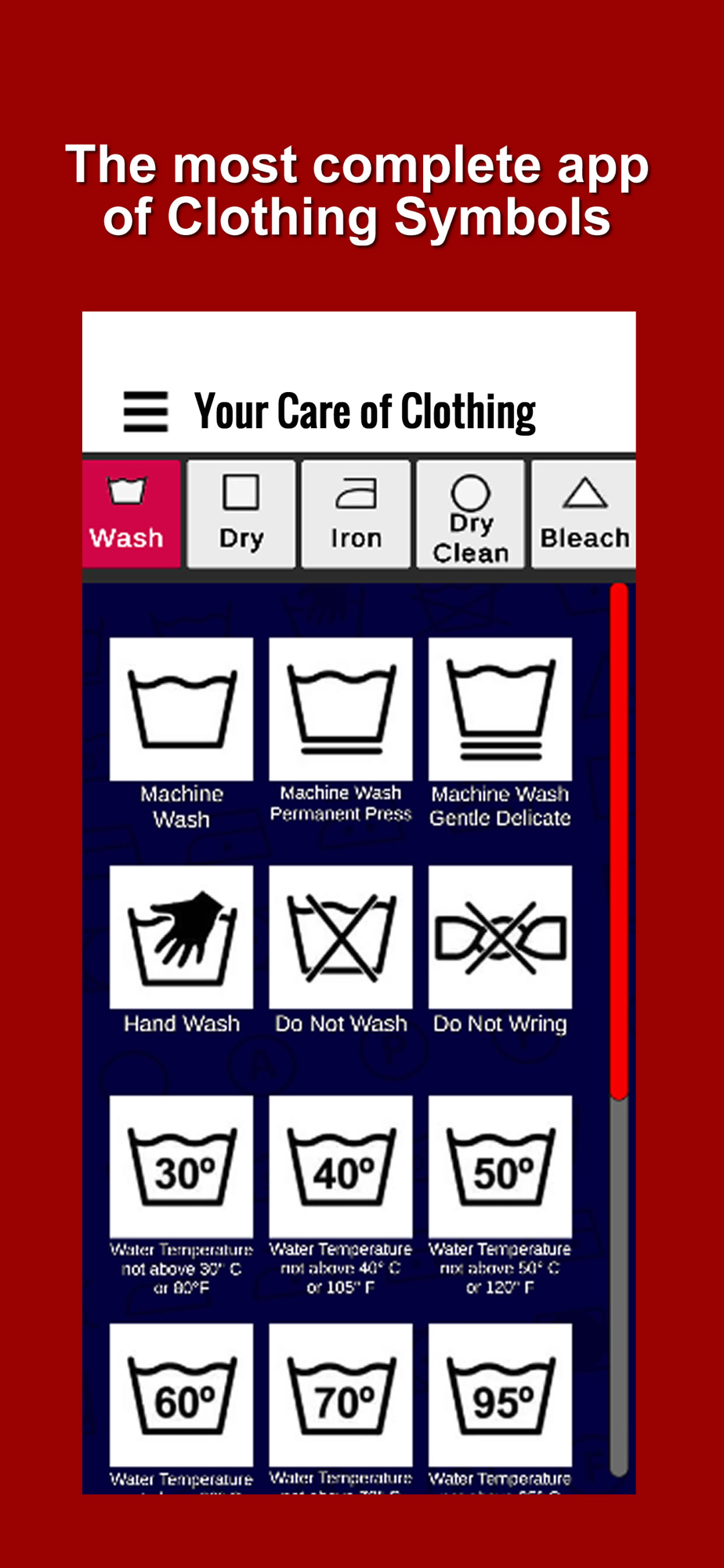 Your Care of Clothing app is the most complete tool with more than 60 elements to know the meaning of each symbol on clothing labels.