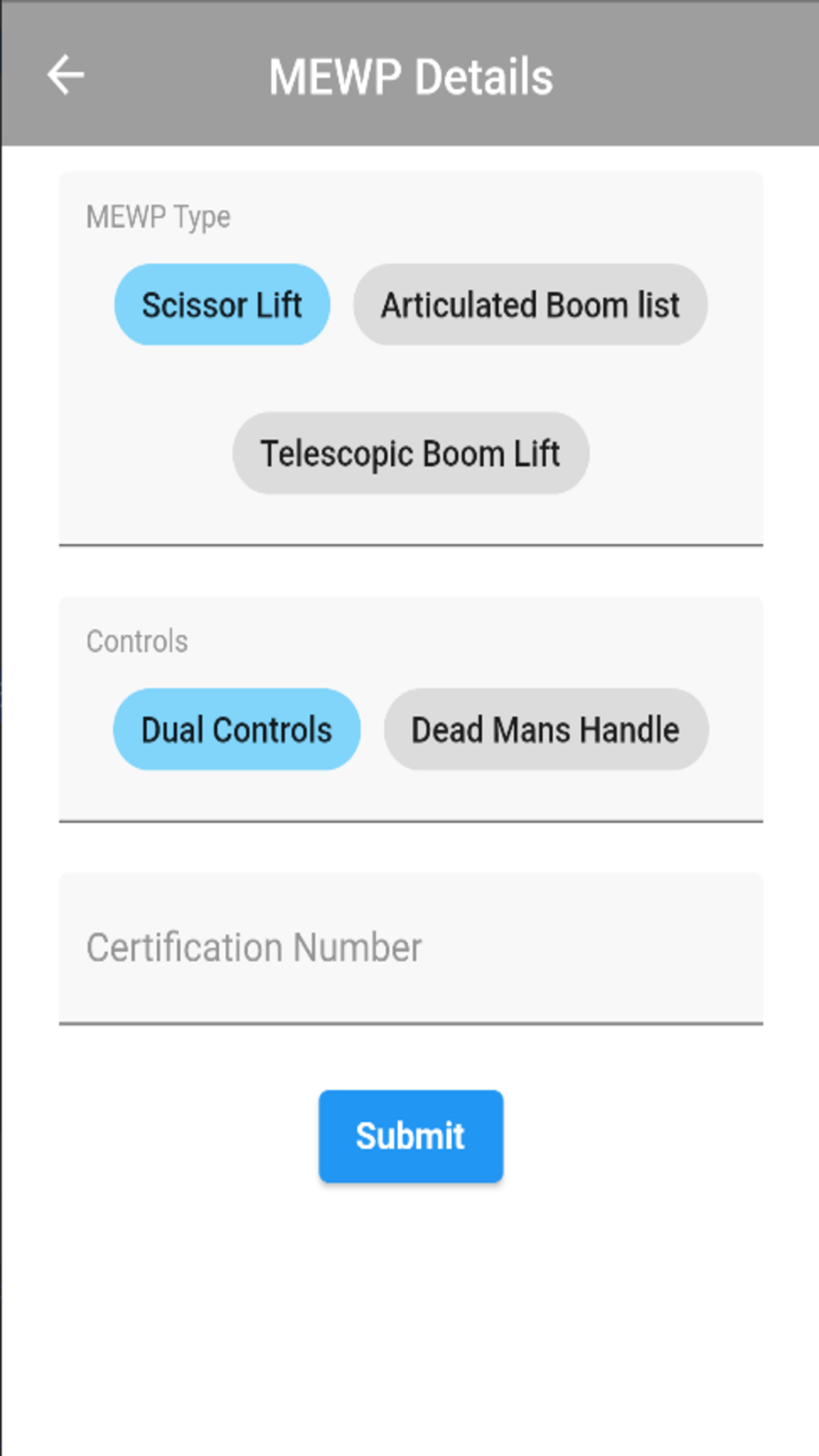 This app is used to enter data for different types of vehicle and hazard checks via form subsections that can be completed individually before being signed off by the user