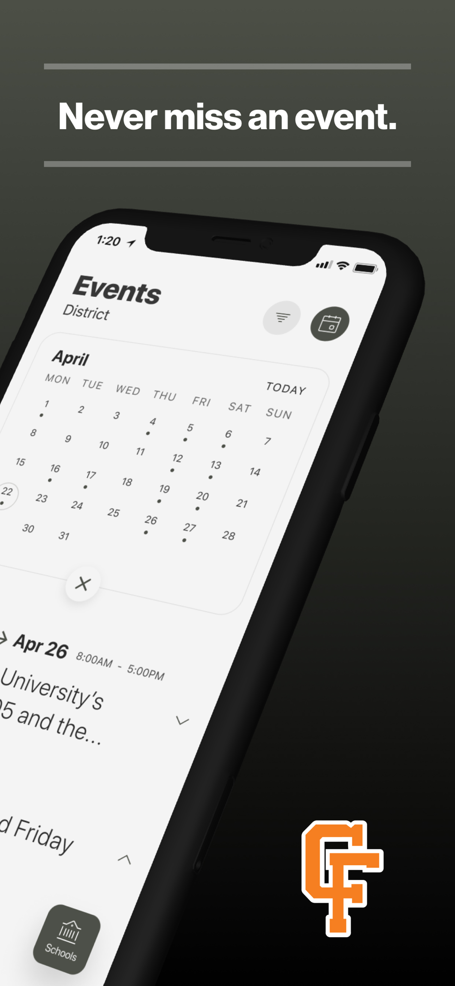 The event section shows a list of events throughout the district. Users can add an event to their calendar to share the event with friends and family with one tap.