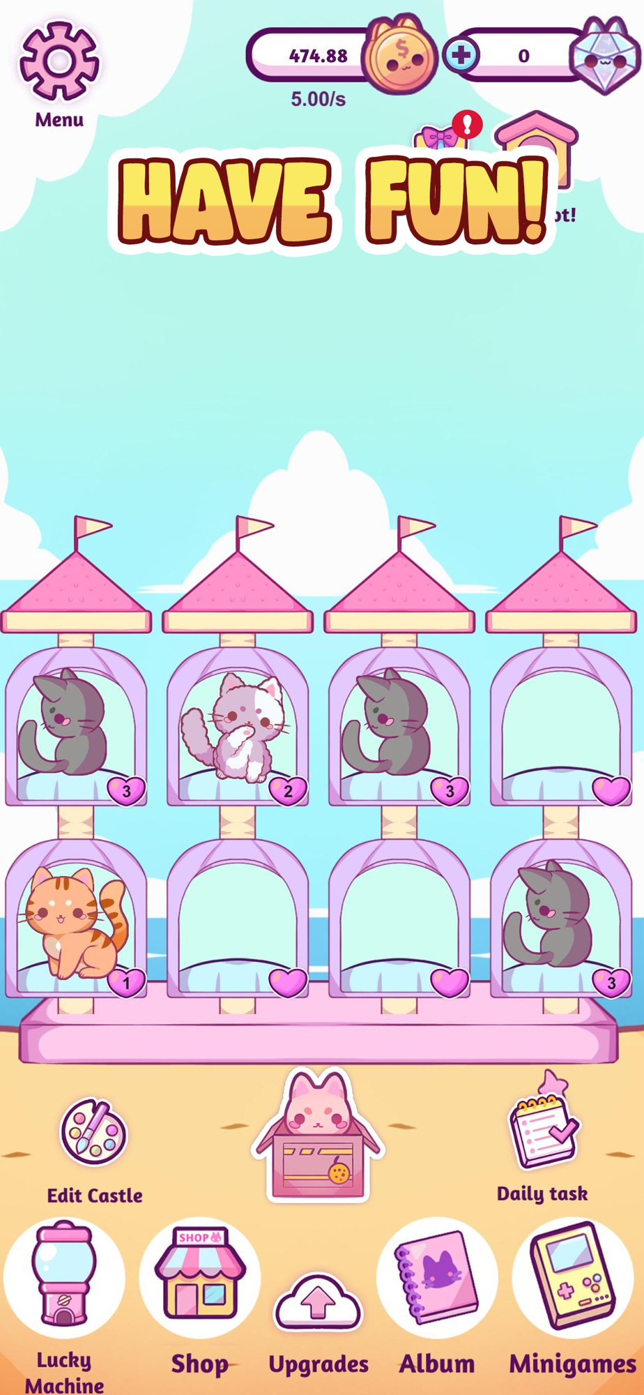 Merge 2 cats to get a new adorable kitty. Start with a few kawaii kittens and then grow your castle into a big, lovely home!