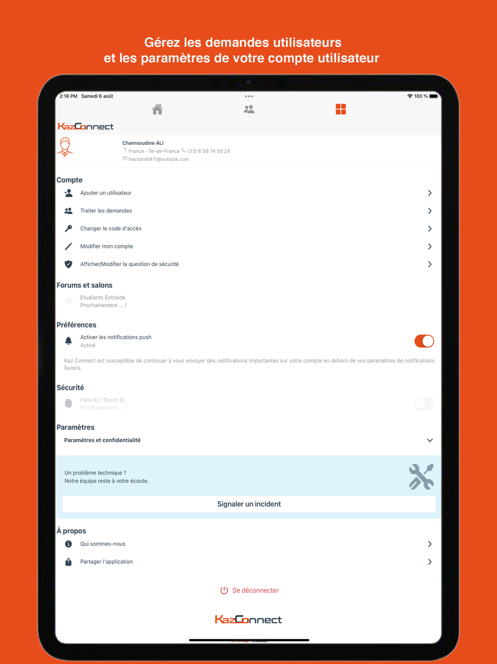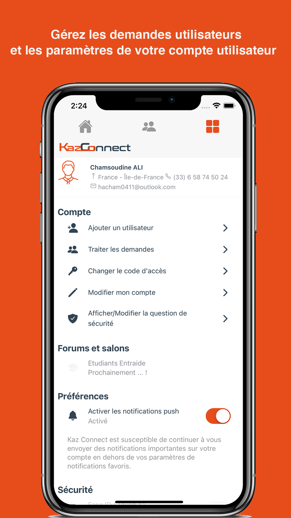 Plus qu'un réseau social, Kaz Connect est une application qui permet aux utilisateurs de se connecter à tous les Mkazien.nes du monde entier. Les informations des contacts sont toujours à jour et sécurisées !