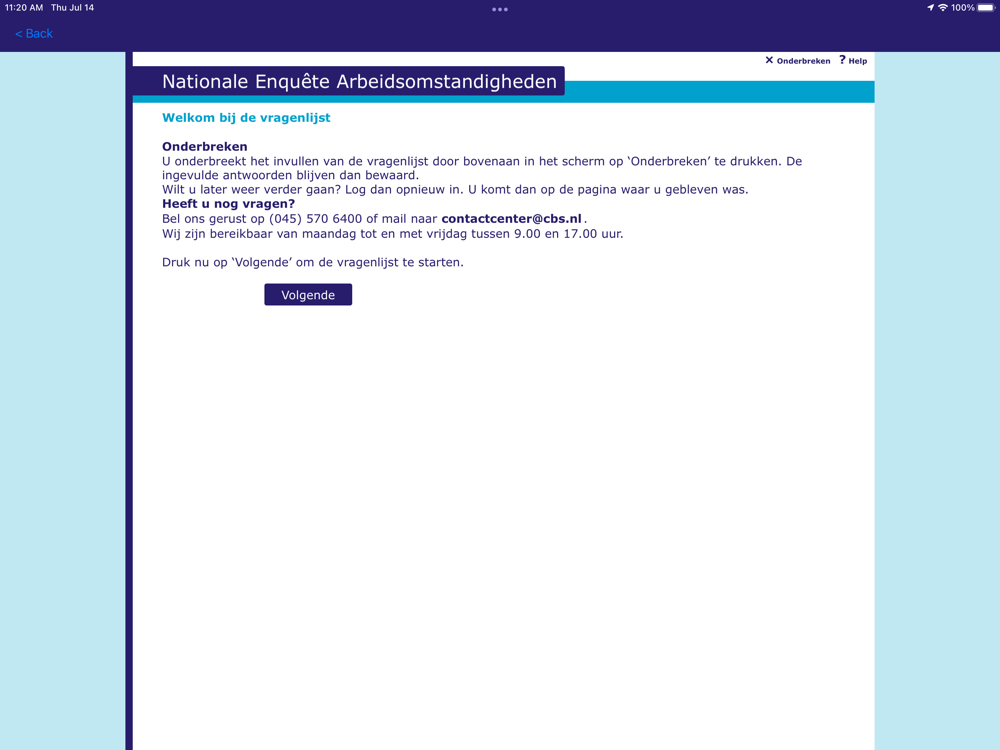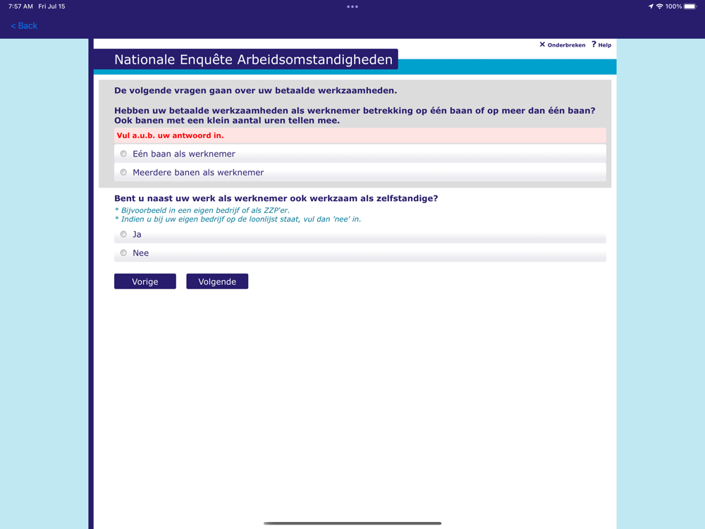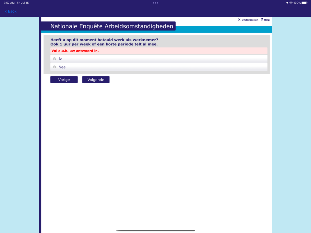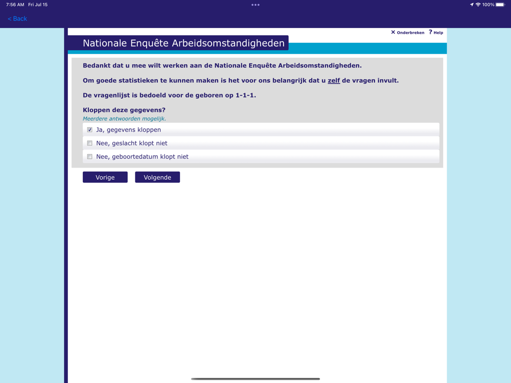 This app can be used for both online and offline surveys. For online surveys it is required to have an internet connection for the duration of the survey, since the survey is running on a Blaise server park in this case. The app sends the answers to the questions to the server and the server calculates a response based on the given answers and the rules and checks that have been defined for the survey. The response is sent back to the app and displayed to the user.