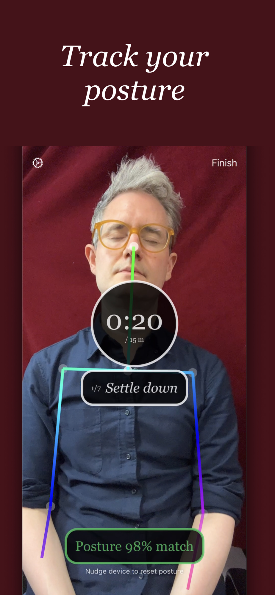 Sit Still lets you track your posture using augmented reality, so you'll maintain an upright, self-supported position while meditating. It can be gentle or, for fun, it can be very impatient!