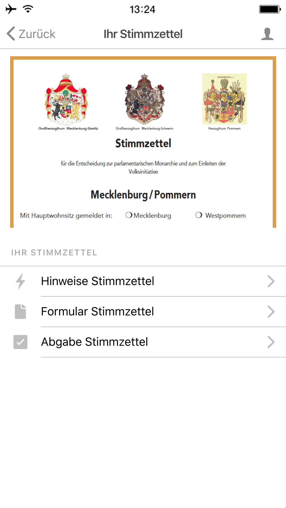 Vielen Dank für das Interesse an unserer APP. Wir informieren Sie über den Wandel in Mecklenburg und Westpommern. Die App unterstützt Sie auch bei Ihrer Suche nach Ansprechpartnern in Ihrer Region, Stammtischen und der Weitergabe von Stimmzetteln. Außerdem finden Sie alle Kontaktdaten zum Team des Großherzogs Friedrich Maik®