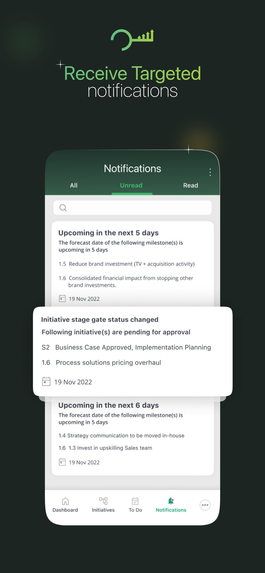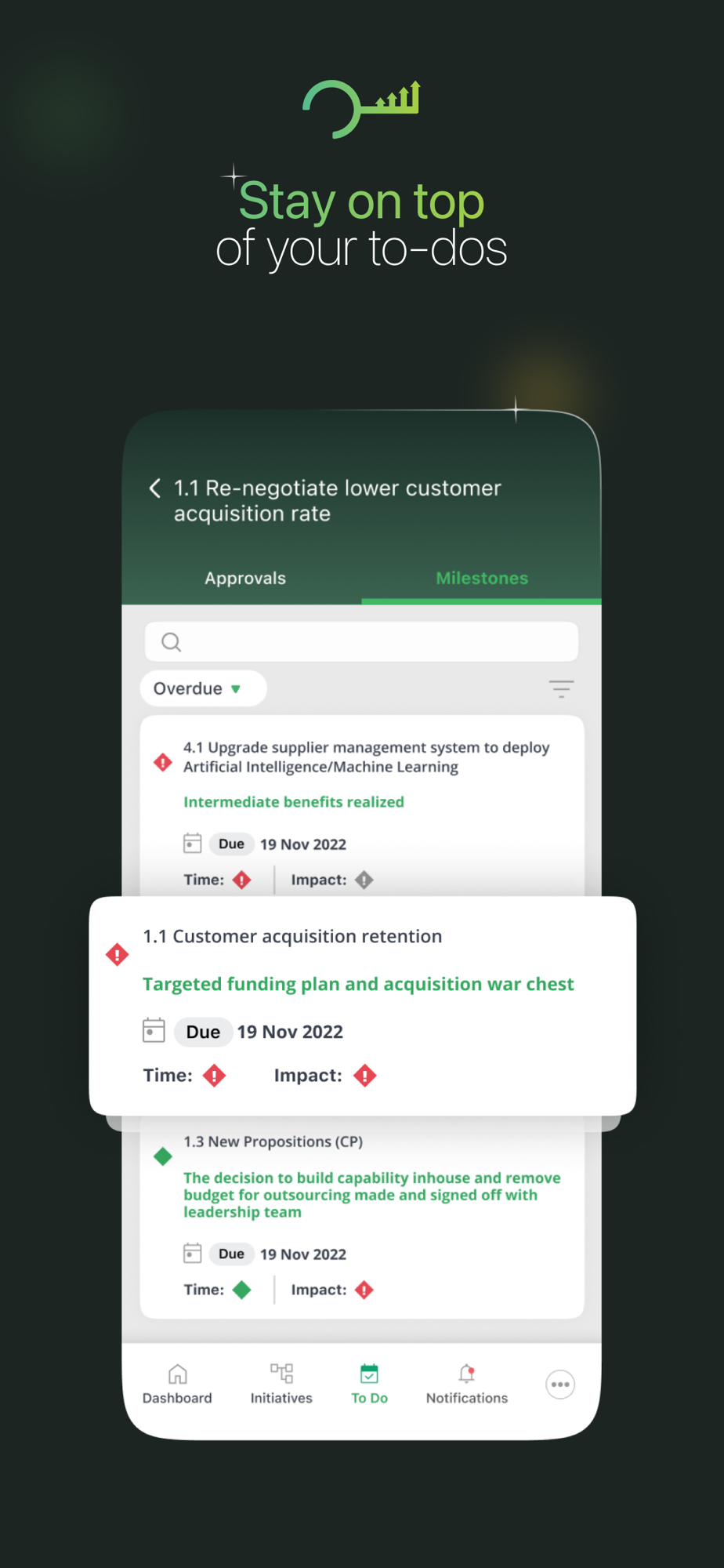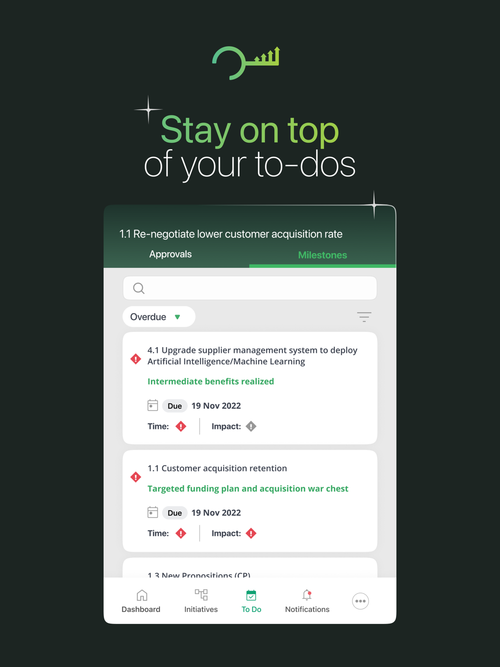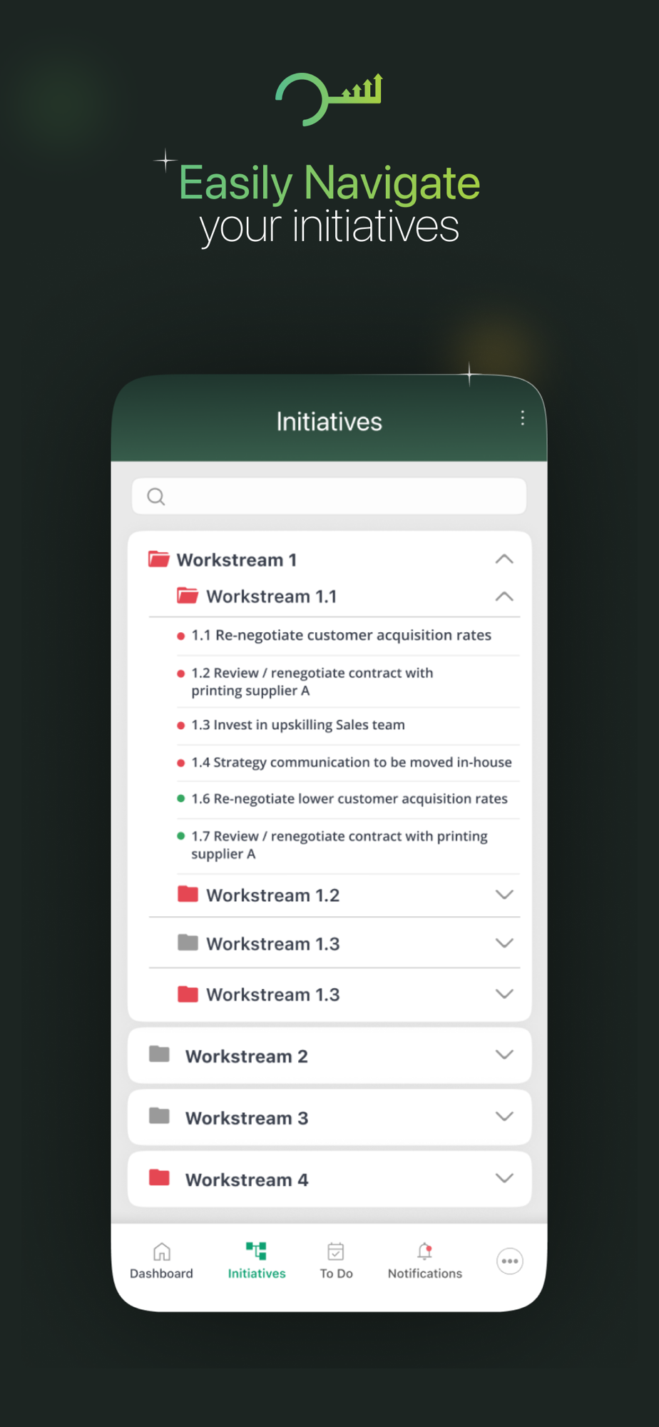 KEY by BCG empowers companies to design and steer their own transformation toward value realization, managing a whole initiative portfolio and single initiatives from idea generation to full implementation, all with a straight line to value: