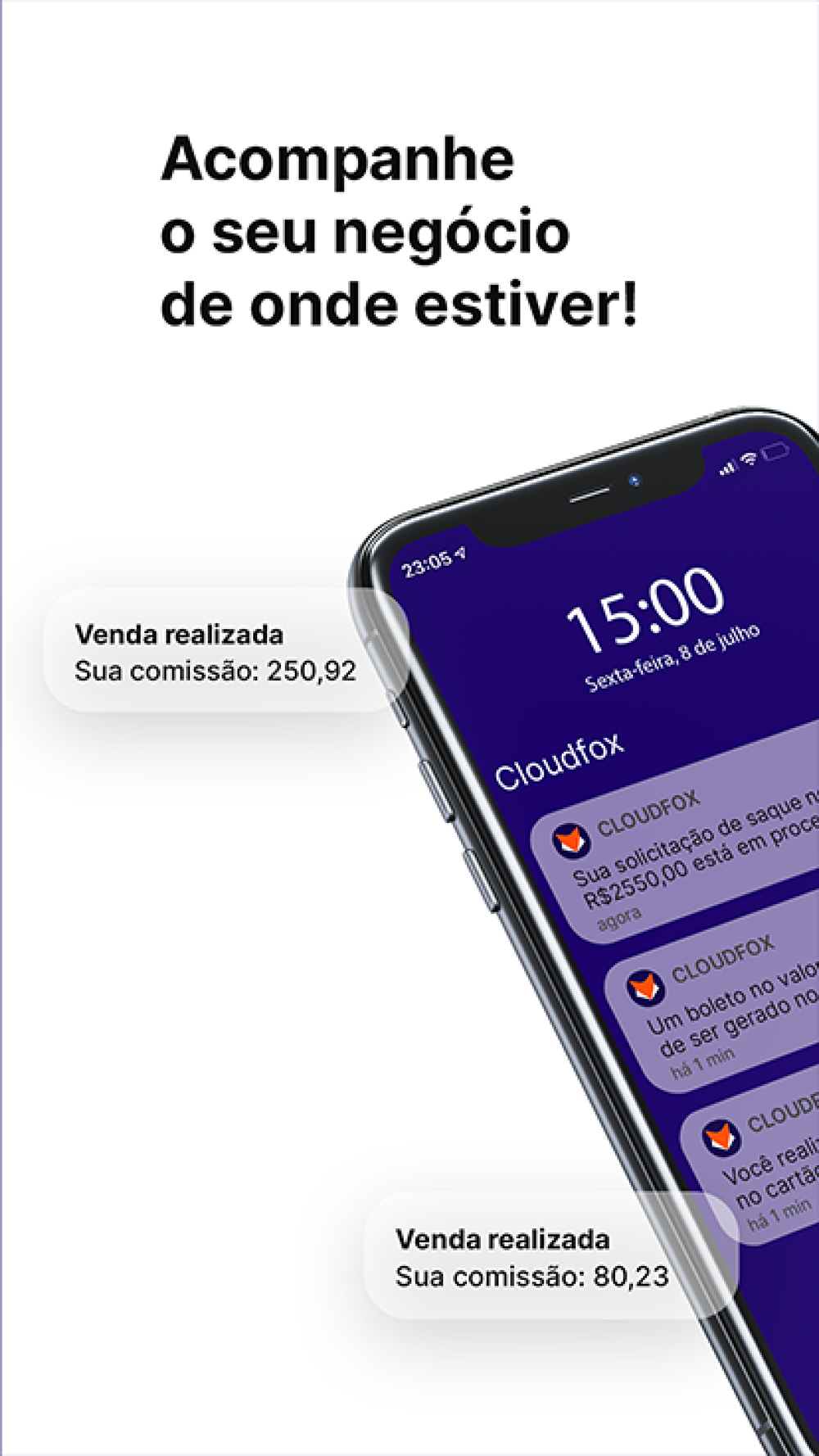 Leve e dinâmico como a cultura da Cloudfox, nosso aplicativo oferece rápido acesso às informações importantes sobre sua loja, notifica todas as vendas em tempo real, permite efetuar saques e muito mais.
