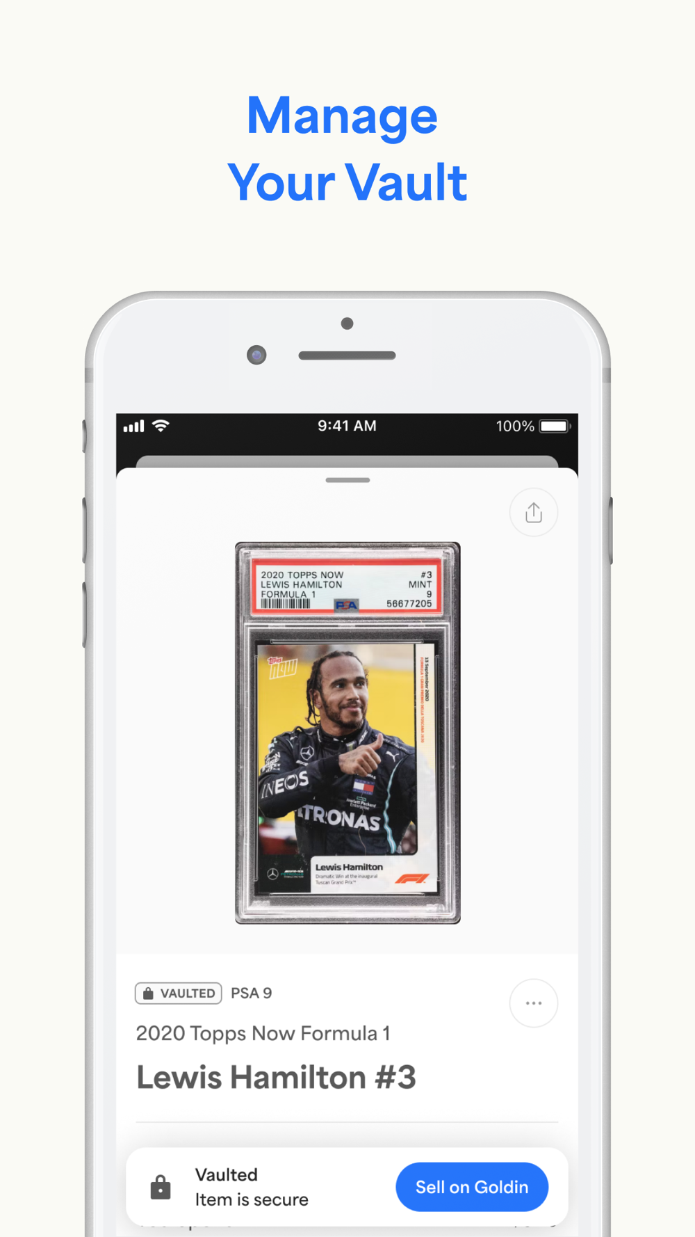 Send your cards to Collectors Vault, a state-of-the-art physical storage facility to store and insure cards free of charge. Once your assets are secure in Collectors Vault, they can easily be made available for sale via Goldin.