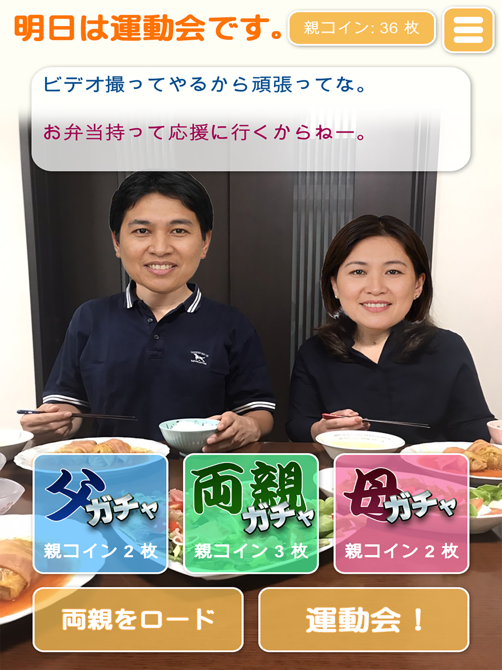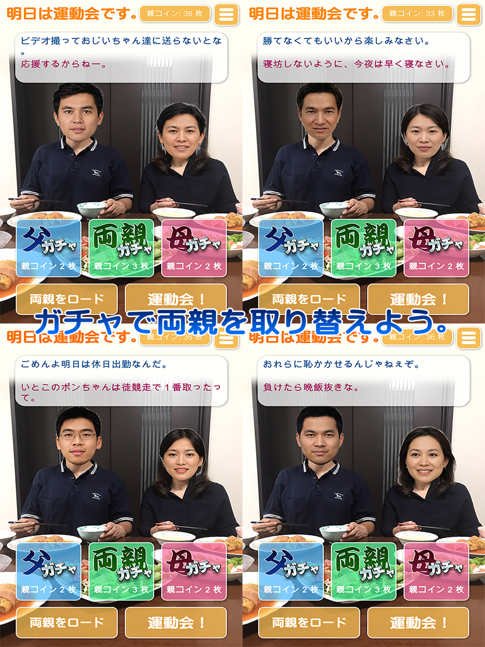 「親コイン」を使ってガチャを繰り返し、素敵な両親を手に入れましょう。