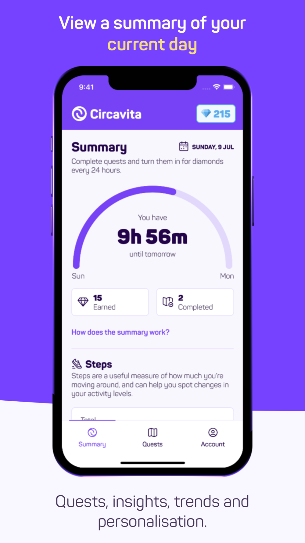 Gamify your life using your health and fitness data, complete quests and turn them in for diamonds every 24 hours. COMPLETE QUESTS Fun and engaging quests to motivate you to live a healthier and more active life. GET DIAMONDS Completing a quest will reward you with diamonds. Get as many as you can! WORKS WITH APPLE HEALTH Apple Health gathers health and fitness data from compatible devices and apps. Circavita uses your data for quests, insights, trends and personalisation. Use your Apple ID to save your progress no matter what happens to your device, and more. Circavita is not a substitute for professional medical advice. Always consult your physician first. Questions, suggestions or other feedback? Please email