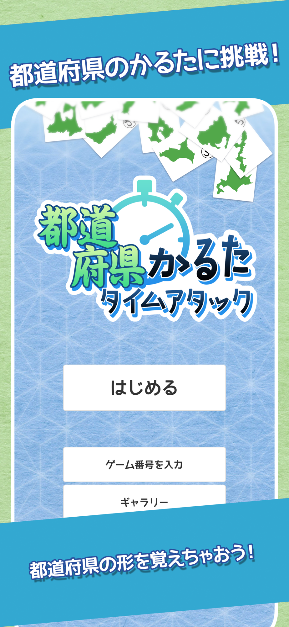 都道府県かるたです。出題される都道府県の名前を見て、対応する取り札をできるだけ早くタップすることで進めていきます。