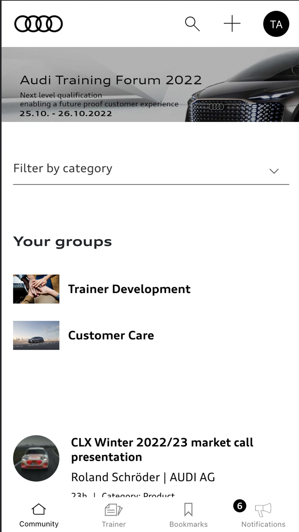 With the Audi Qualification Gateway App, you receive the latest information about training and qualification from AUDI AG. You are able to share your training needs or information about your existing training concepts with the international training community. You can ask questions and get in contact with training colleagues from all over the world.