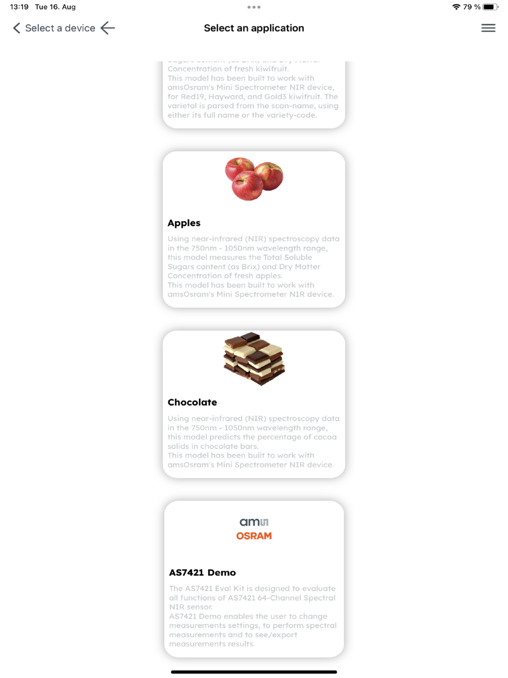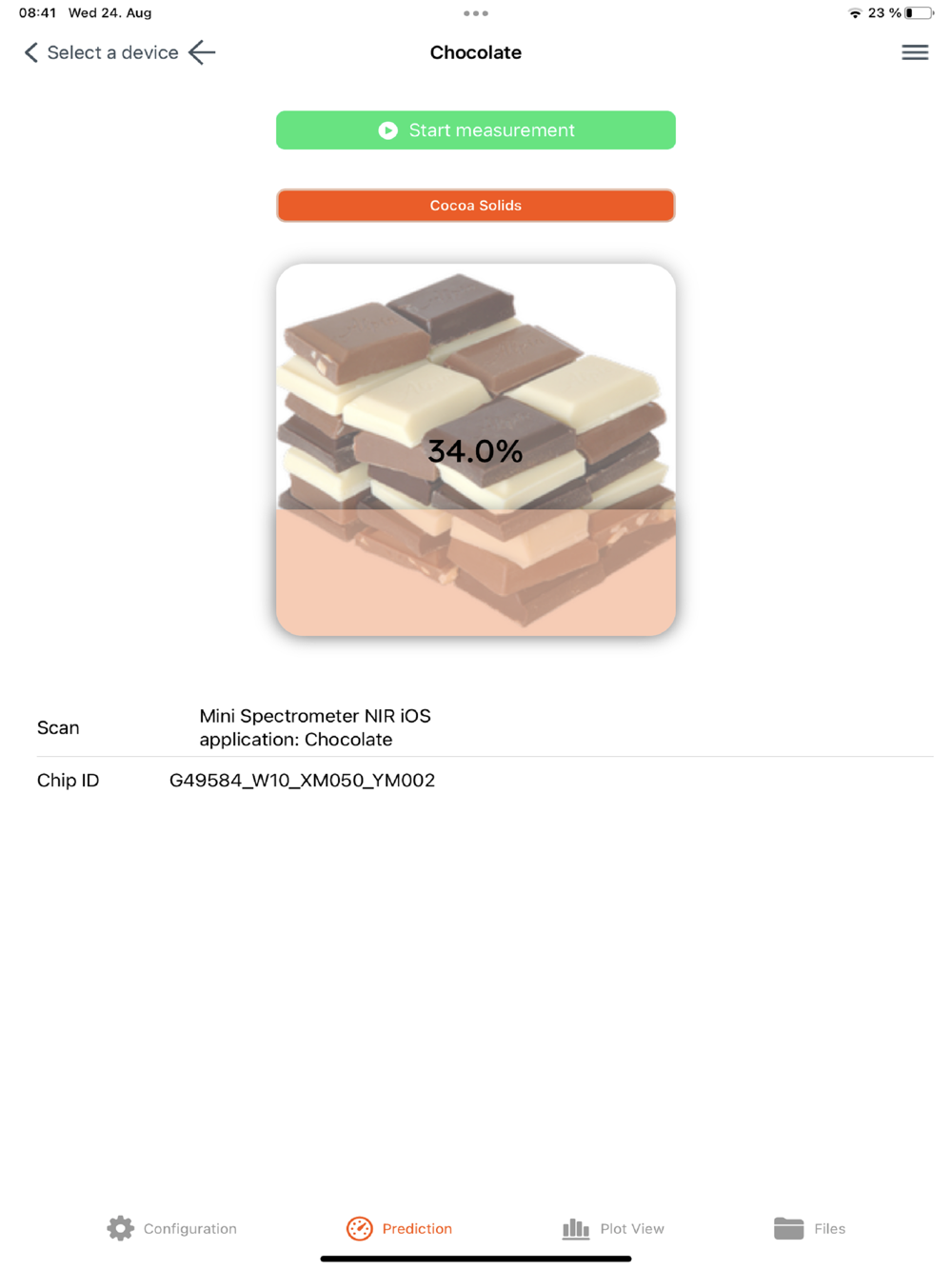 - Included chemometric models for BRIX (sweetness/tartness), Dry Matter (firmness/freshness) in Apples/Kiwi fruits & cocoa quantification of chocolate bars.