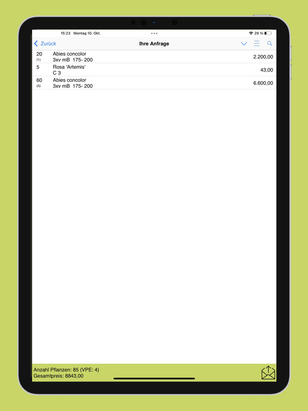 Die Artikeleingabe erfolgt über Abkürzungen - so genannte Matchcodes - (z.B. ac gl für Acer platanoides ‚Globosum‘). Es kann aber auch über deutsche Namen und auch deren Abkürzungen gesucht werden. Das System erkennt diese automatisch.