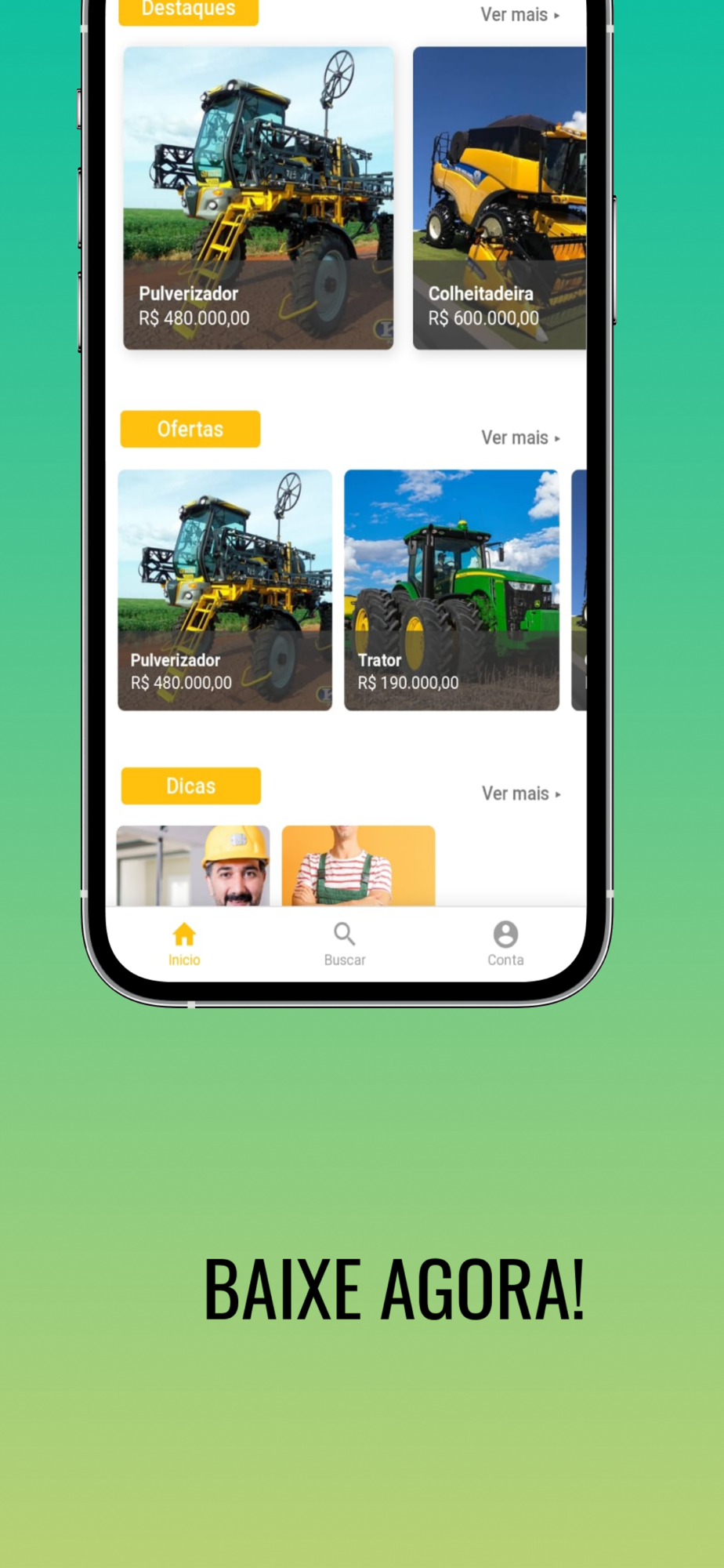 Compre e venda máquinas e implementos agrícolas com segurança e praticidade usando o aplicativo da ONMAQ.