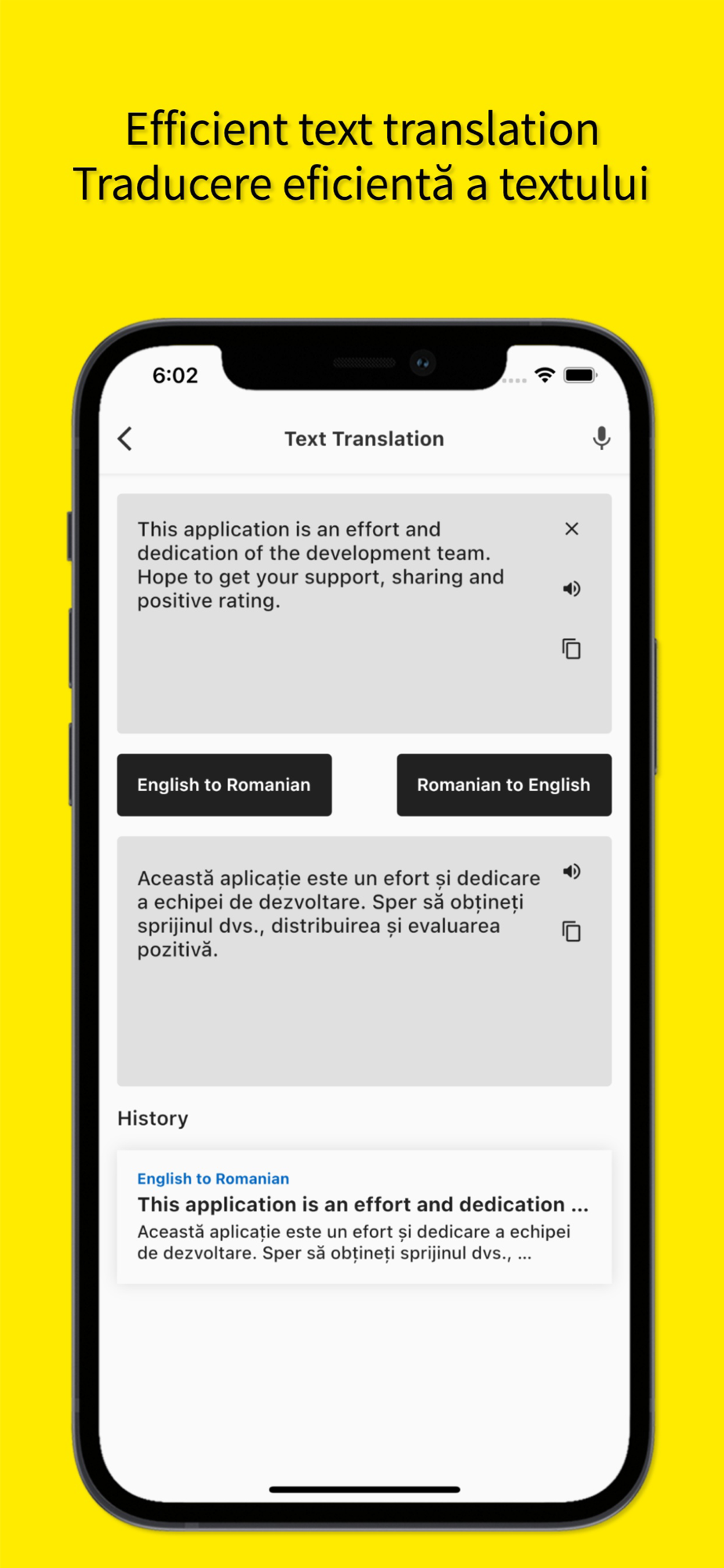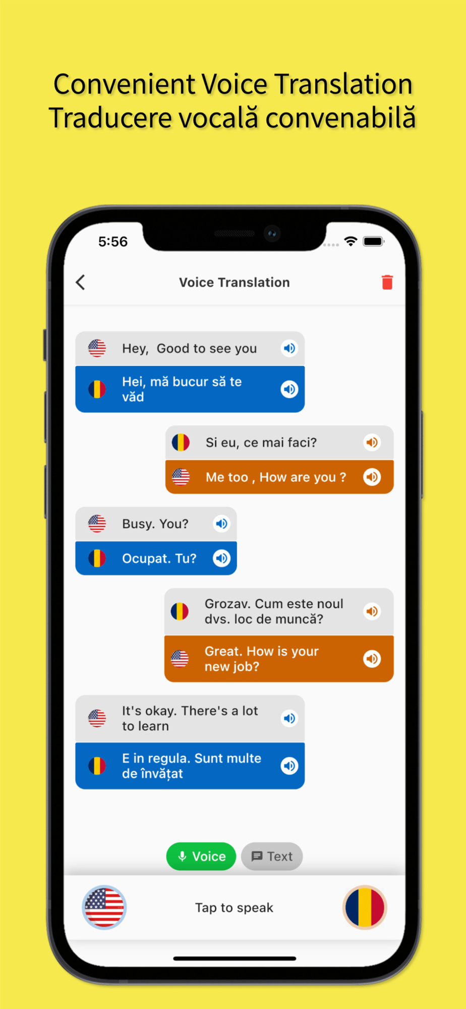 Real-time English or Romanian text translation for phrases and words, voice to text translation