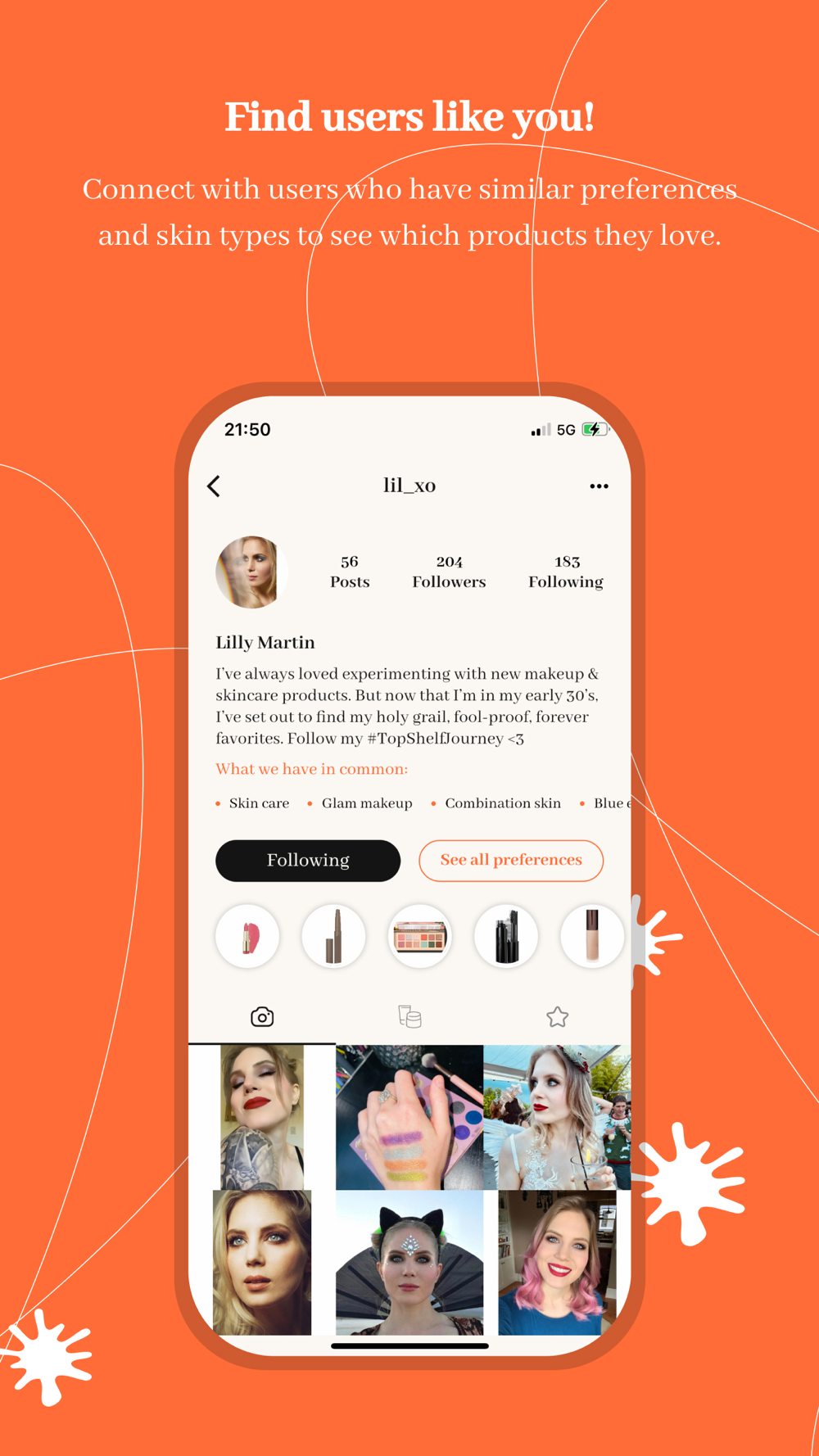 Add your preferences when you set up your account on Shelf-ish, and the app will recommend users with similar goals, skin conditions, or interests. What works for them might work for you, too! Interested in cruelty-free beauty products? Connect with other users with that interest and discover their favorite brands and items. Have sensitive skin? Check out the products that others use to keep their flare-ups to a minimum.