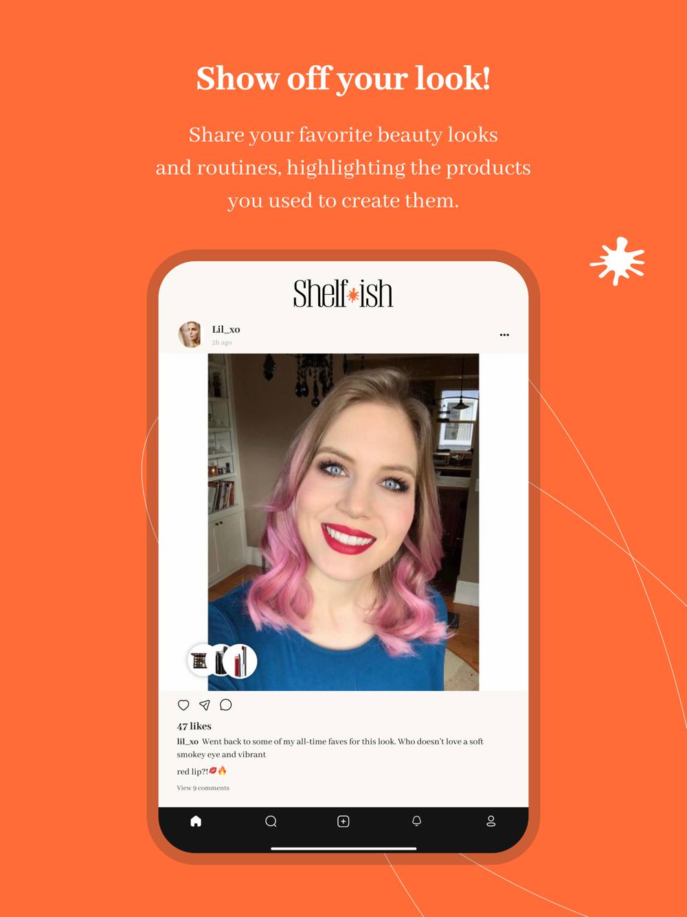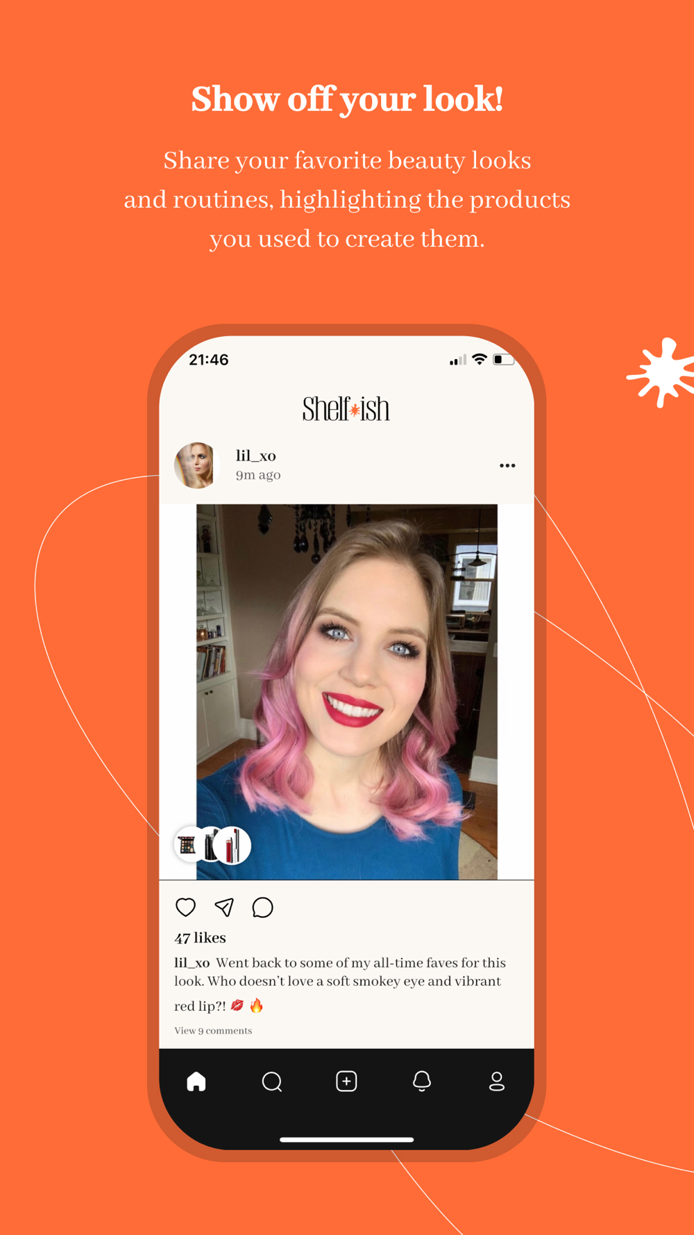 Shelf-ish allows users to post photos of their beauty products in action! Show your friends how your favorite products look on; post your look of the day or your nighttime skin care routine; share a favorite inspiration image. Tag the products you feature in your post, so friends can easily find them in Shelf-ish’s database.