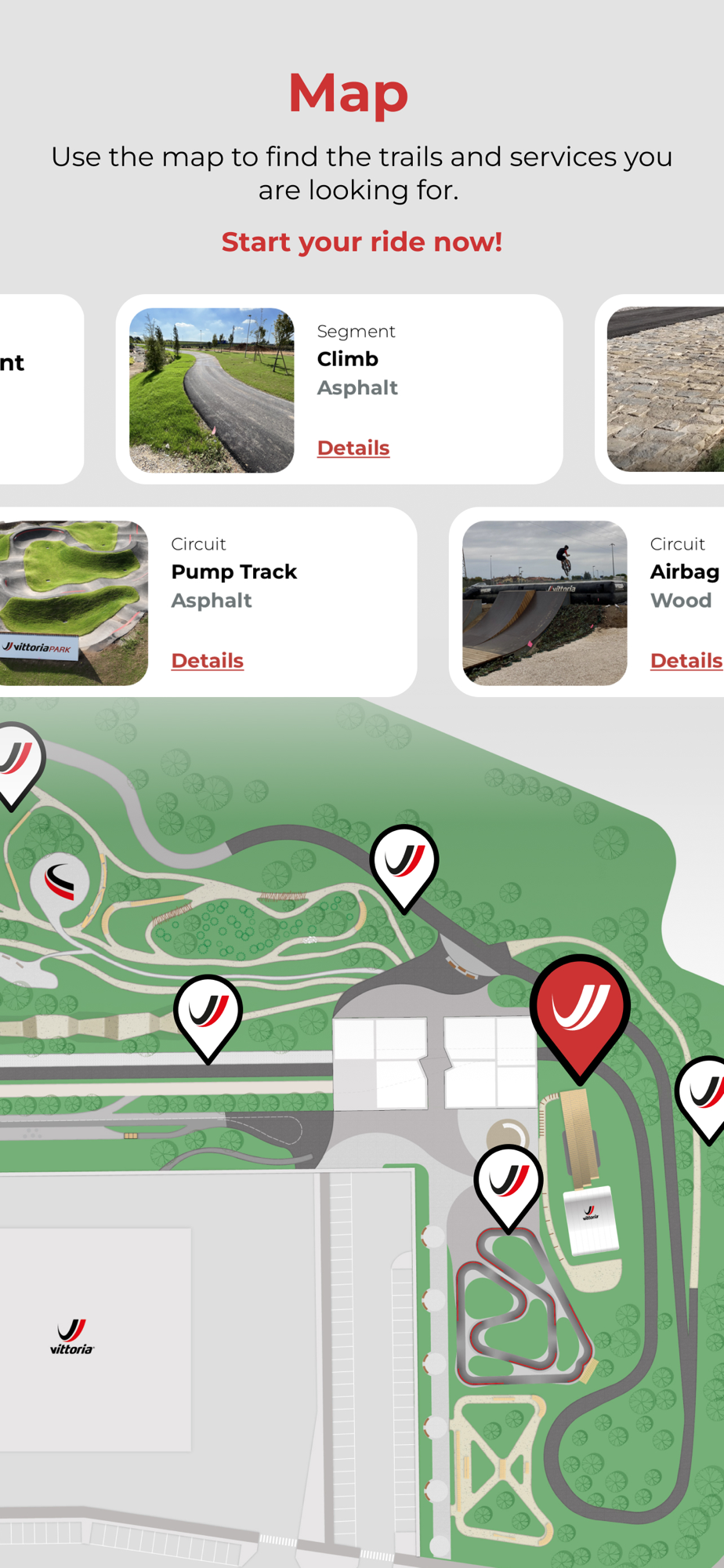 The 5 hectares Vittoria Park is situated close to Milan, Italy, with more than 4km of tracks including different road and gravel surfaces, a replica of Strade Bianche gravel, a Paris-Roubaix and Tour of Flanders cobble stone section, specific road bike loop with different surfaces and banked turns, mountain bike trails with a variety of sections of all difficulties, dedicated jump line for freestyle addicted , as well as a pump track which fit all UCI standards, landing airbag with three different levels of take offs and a newbie skills-and-tricks area.