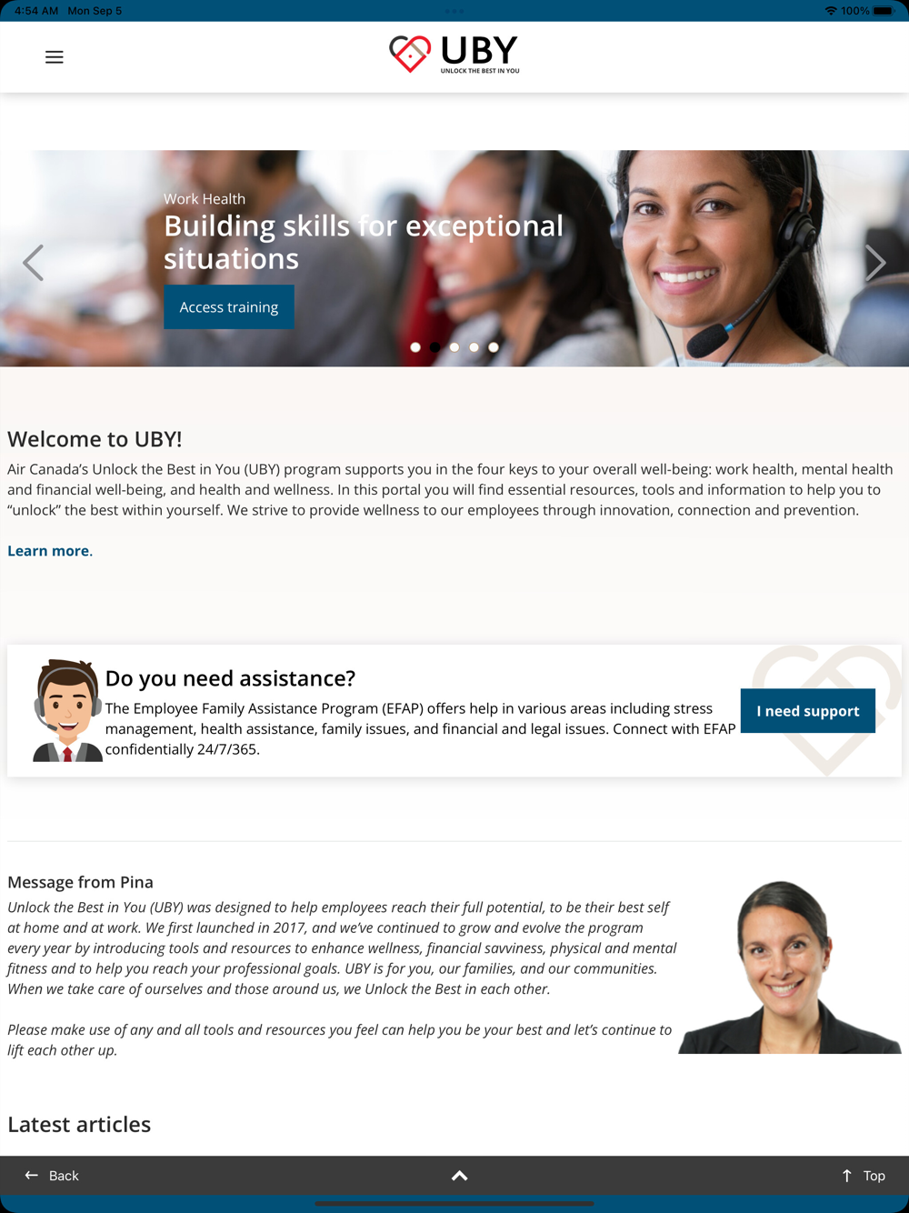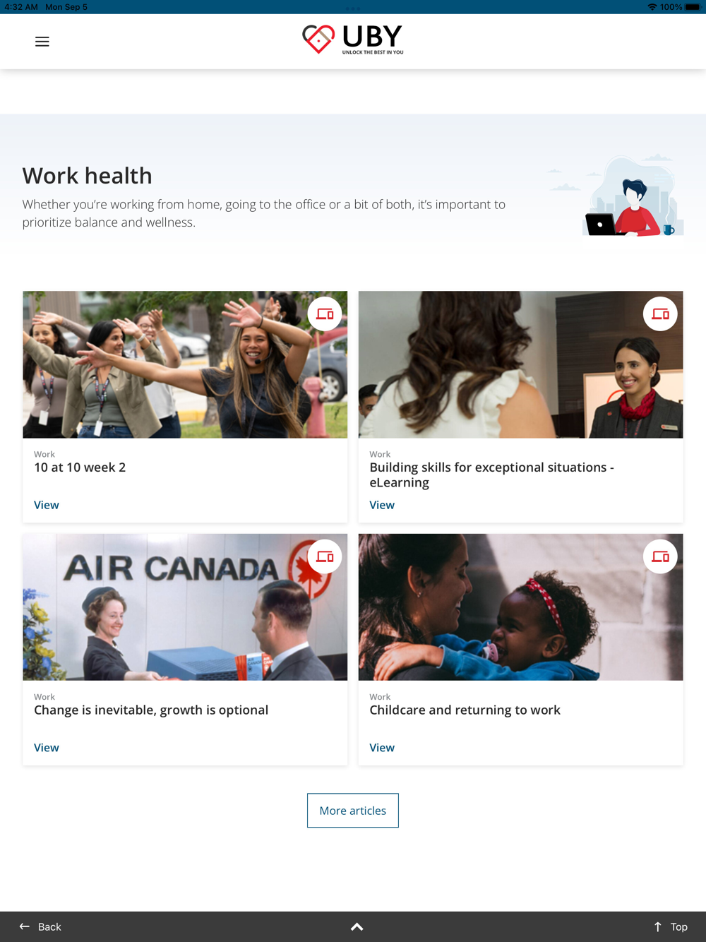 The AC UBY is a mobile-optimized companion app to the Unlock the Best in You (UBY) wellness platform. Users can keep up to date on all Air Canada wellness activities, interact with other participants and track personal wellness progress.
