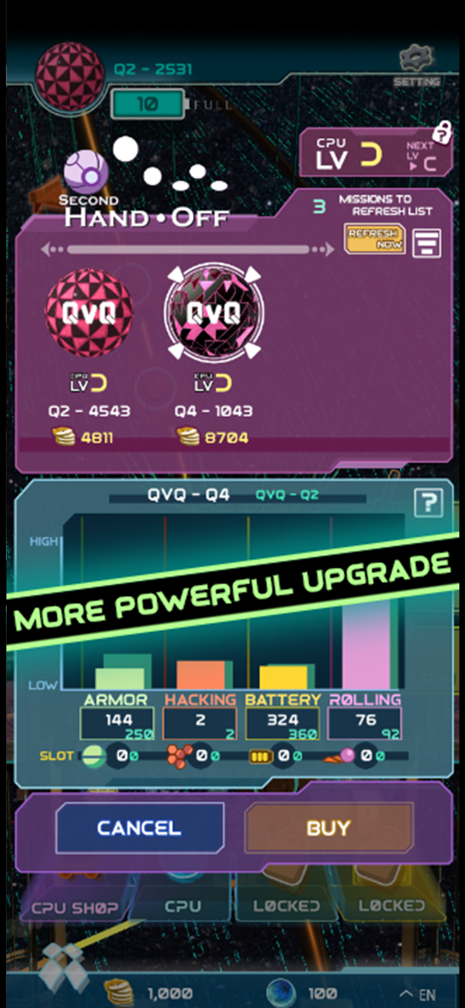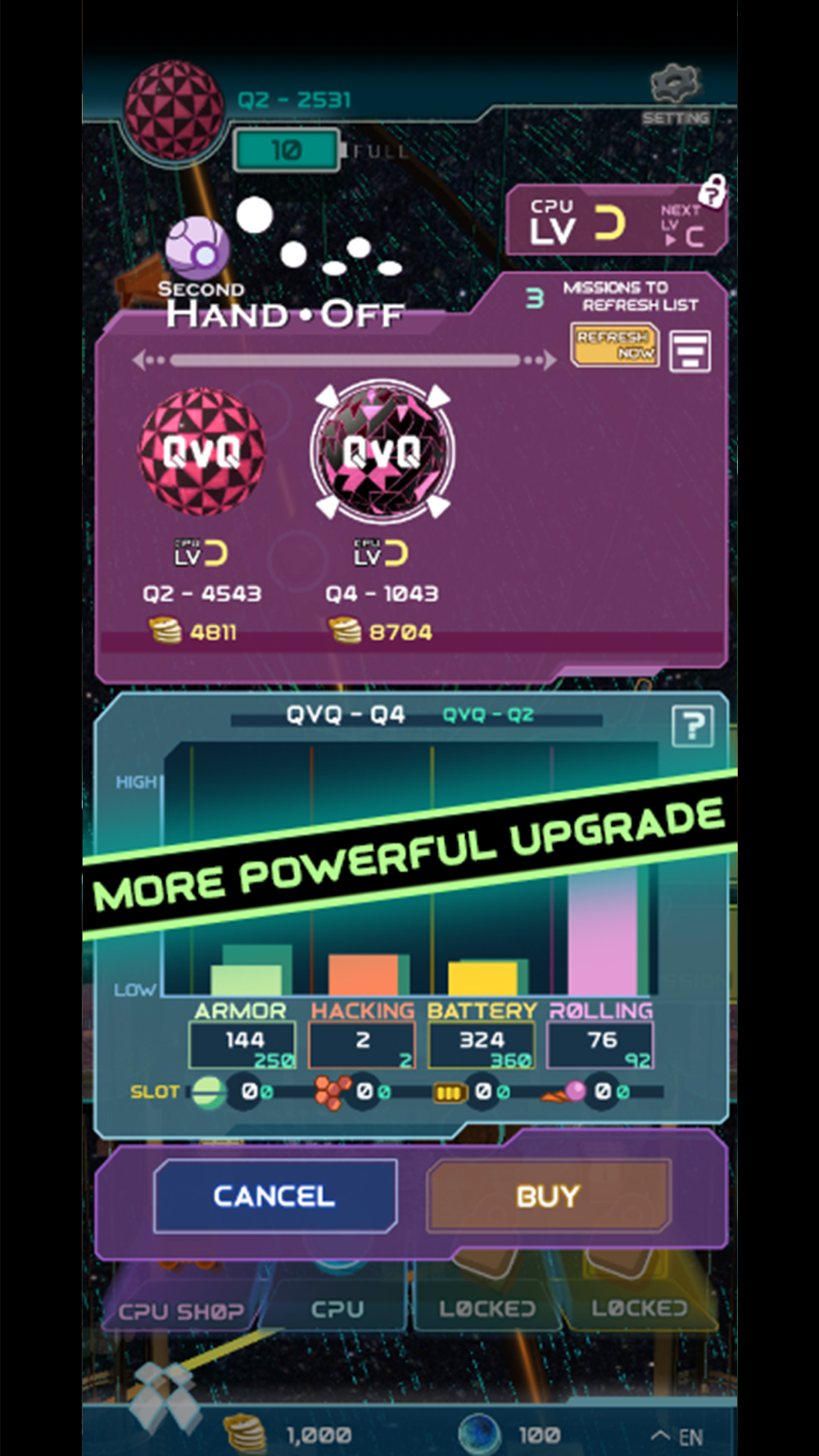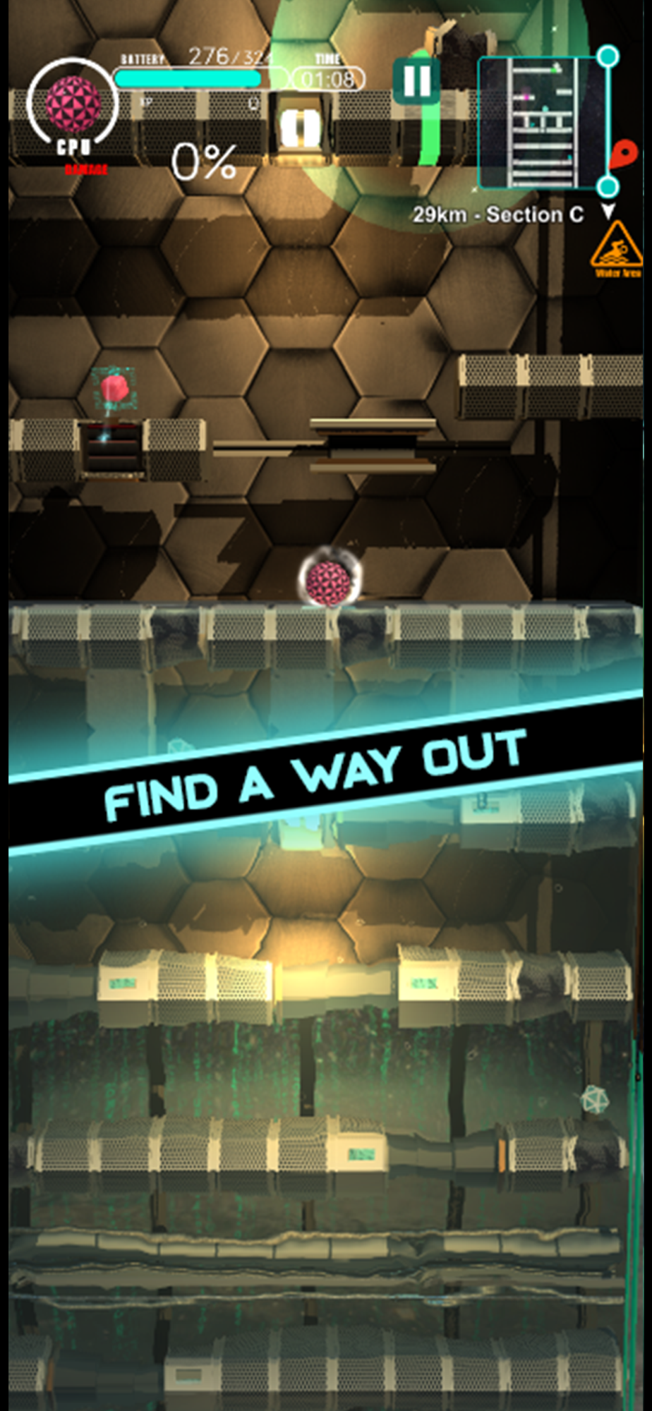 Space tower, where the player controls a neat spherical CPU. Drag to move, hold to stop, charge to sprint. In danger, hold nearby hackable machines to make a way out.
