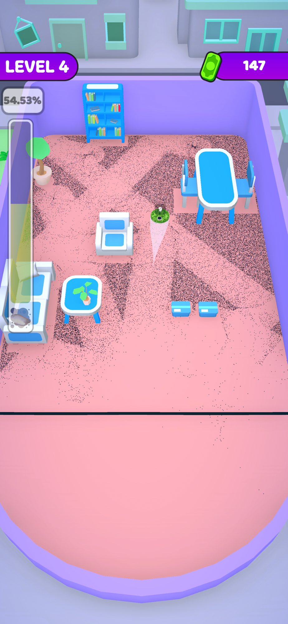 Huge room waiting to be cleaned. Throw your robot vacuum cleaner and start to cleaning the room. Earn money as you clean the room, improve your robot vacuum as you earn money. It won't be easy to clean when there are items all over the place. Remember, the more clean, the more money will earn.