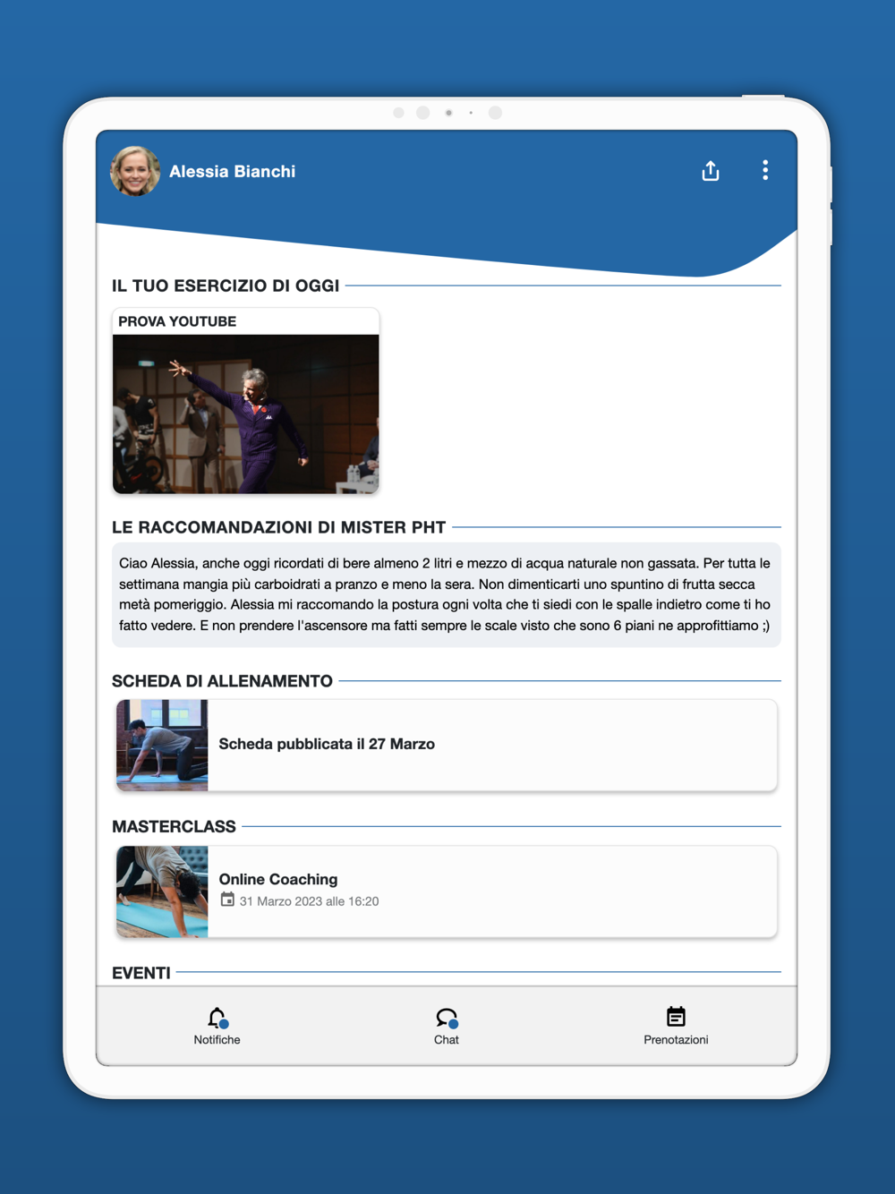 Sulla mia app abbiamo inoltre la possibilità di chattare per rimanere sempre in stretto contatto e condividere dubbi, successi e foto e un’area prenotazioni che ti permette di programmare velocemente le sedute di allenamento insieme.