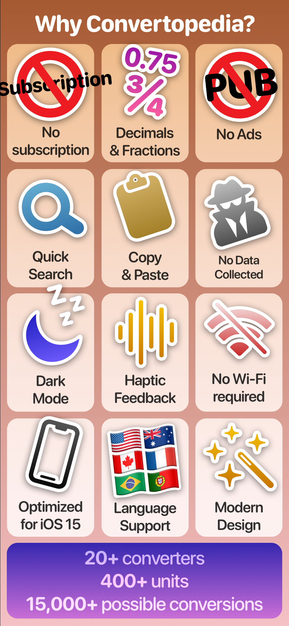 When we designed Convertopedia, our vision was to deliver the first-ever unit converter with no ads, no recurring subscription fees, no spying on our users, and all free to some extent. We were looking to make a product that works offline when you're traveling or in the subway or in an infrastructure made of concrete, and a tool that fits in with the latest trends in terms of design.