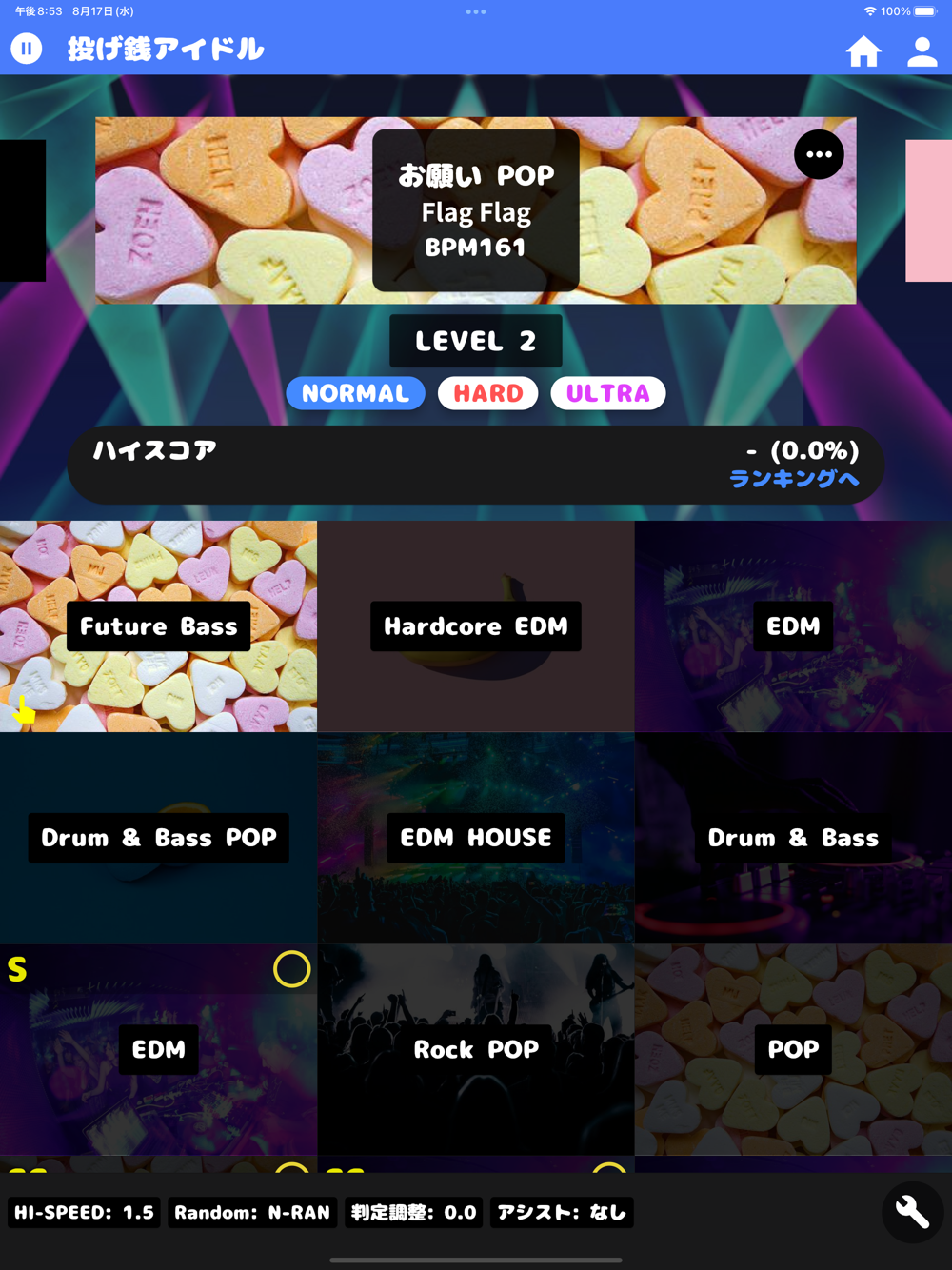 1曲あたり3種類の難易度で遊べます。初心者の方はNORMAL、少し慣れた方はHARD、音ゲー上級者はULTRAで遊べます。