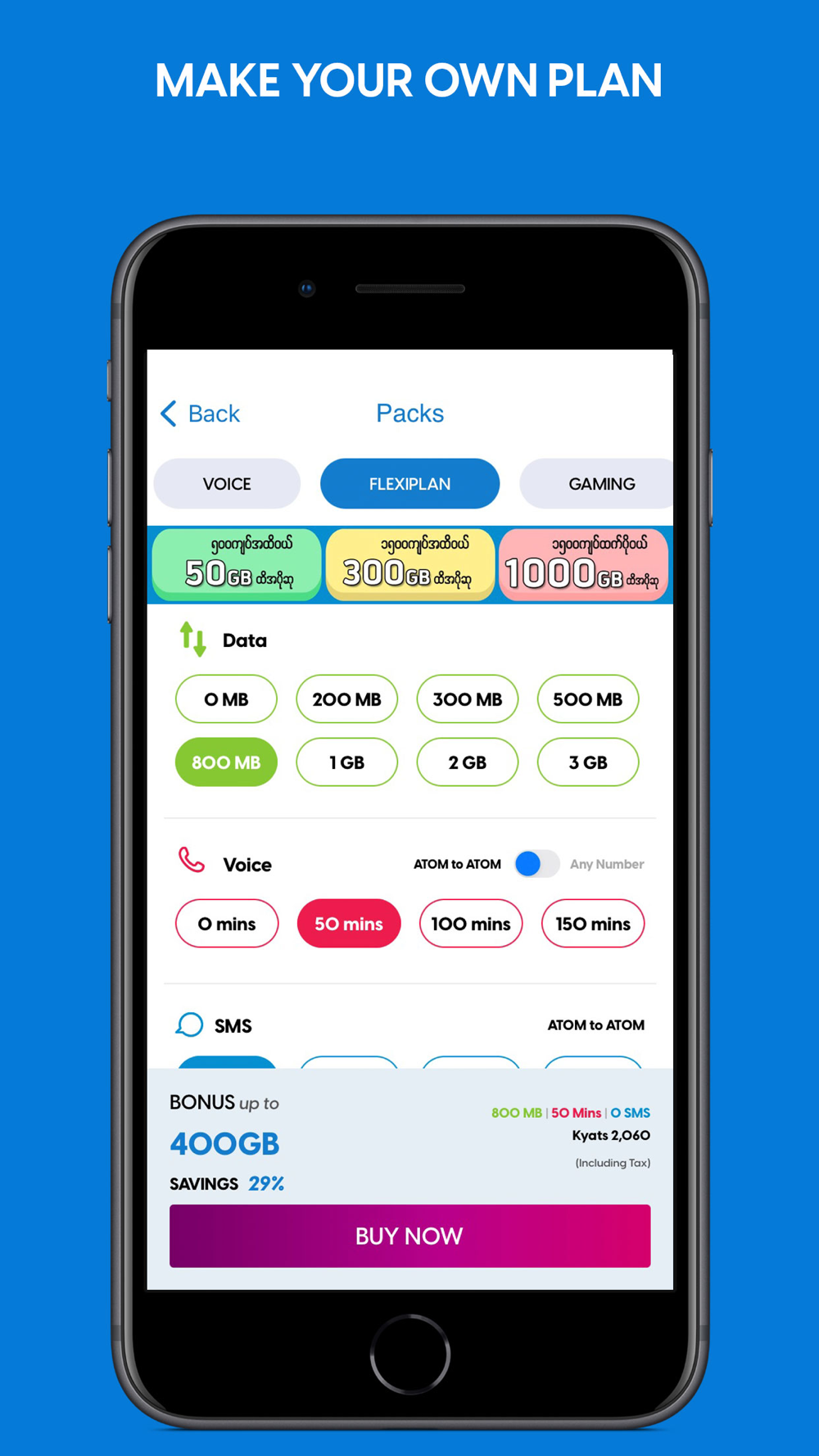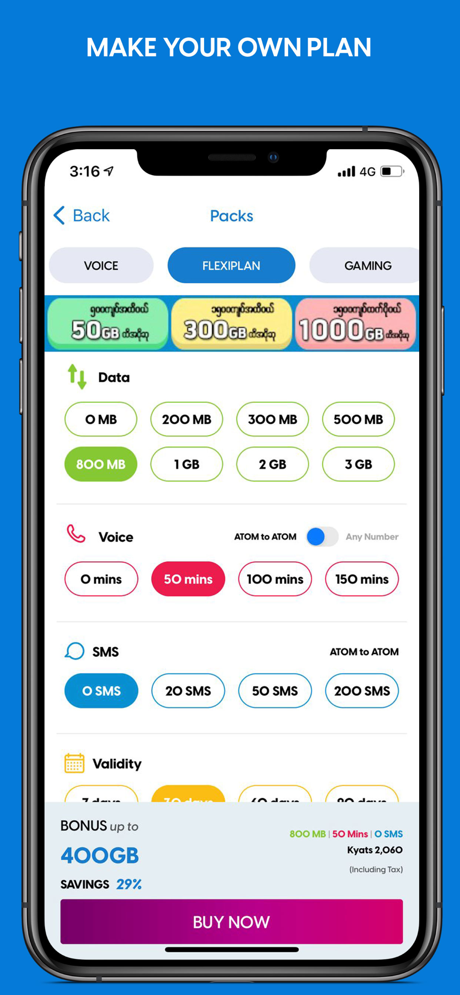 - FlexiPlan: Full freedom to make your own plan or bundle (Data, Voice, SMS, Validity) with great saving and Gift Plan to your friends and family.
